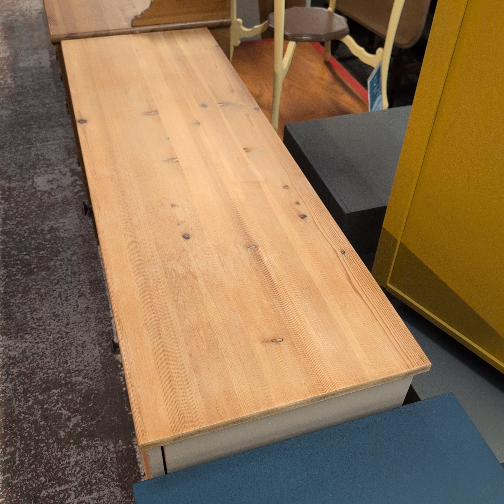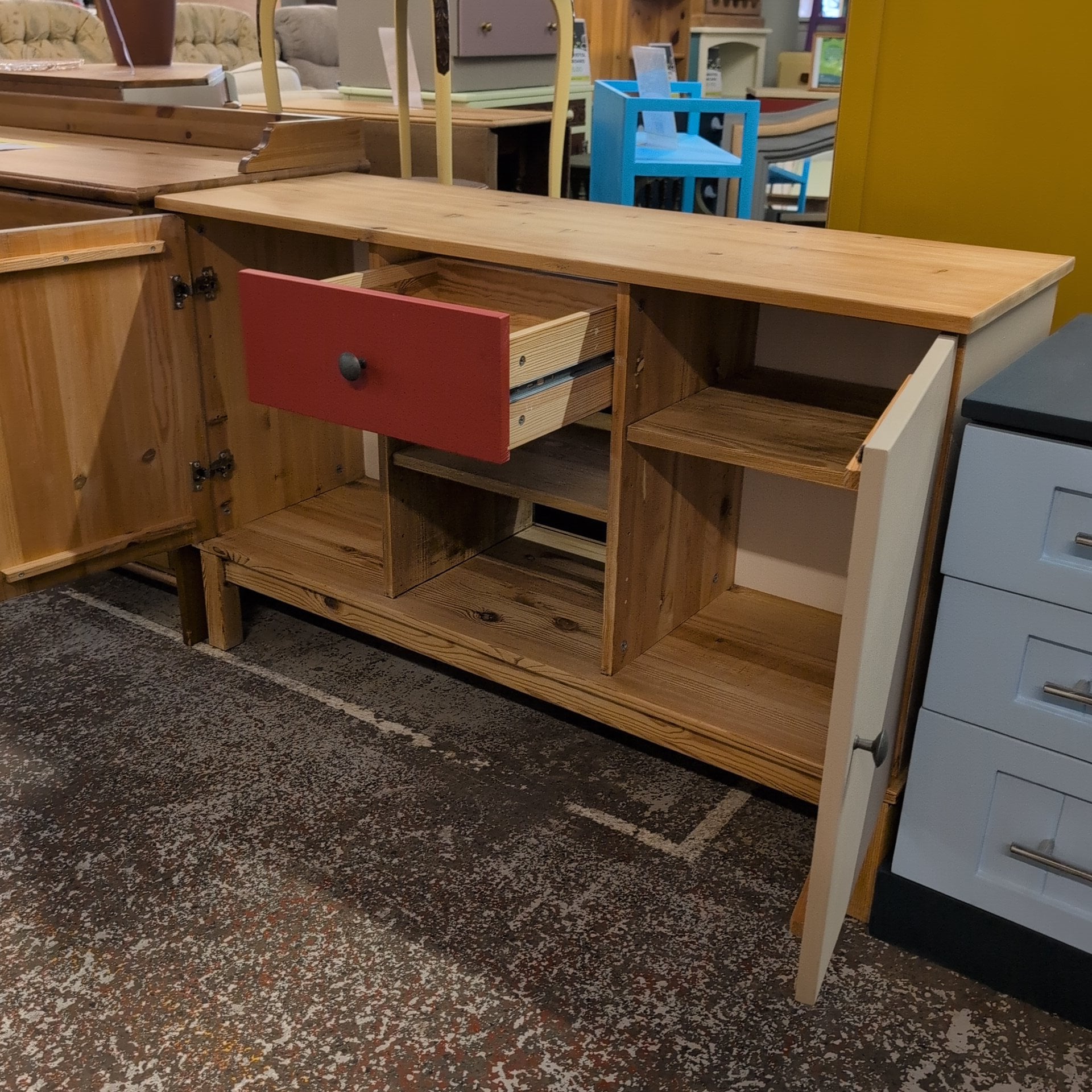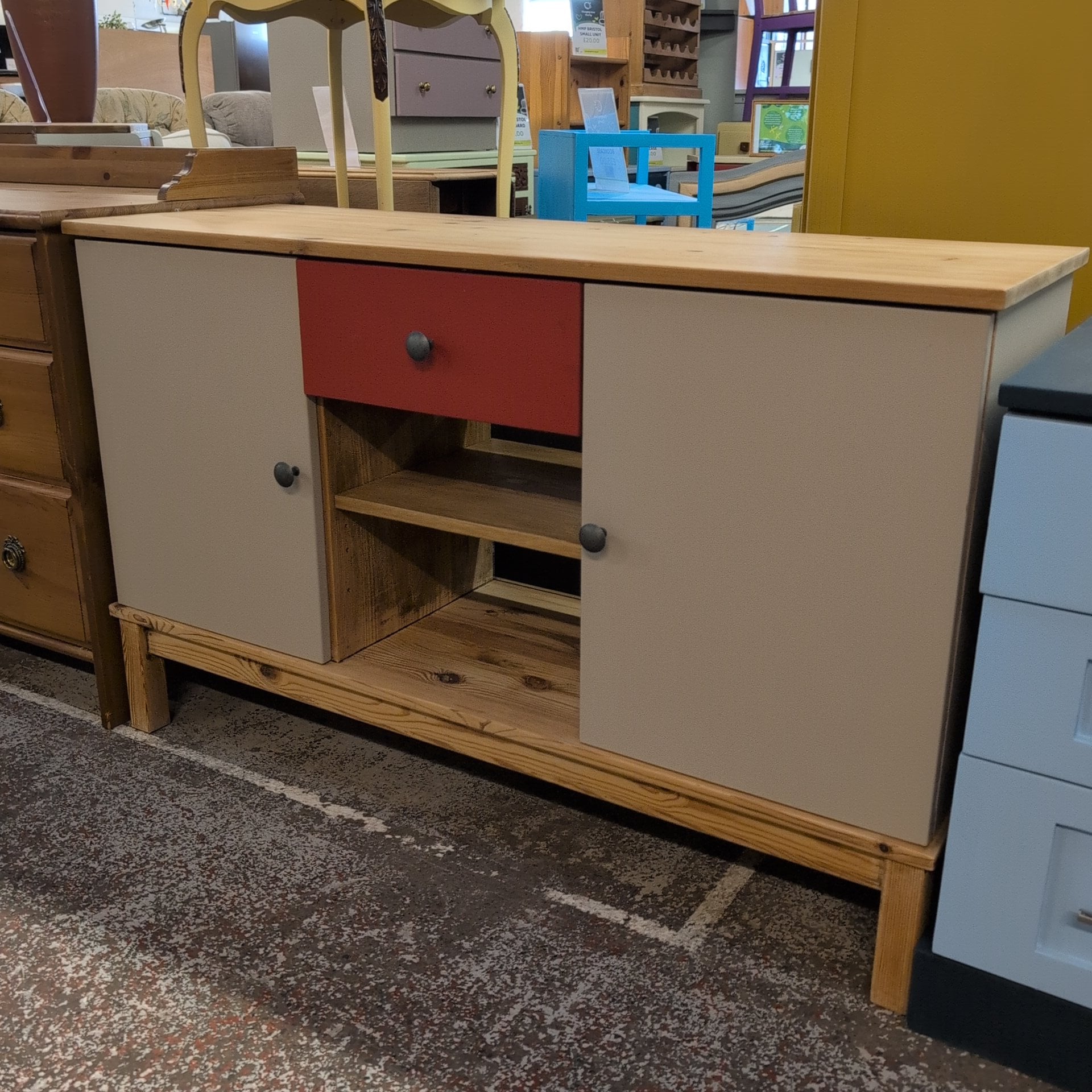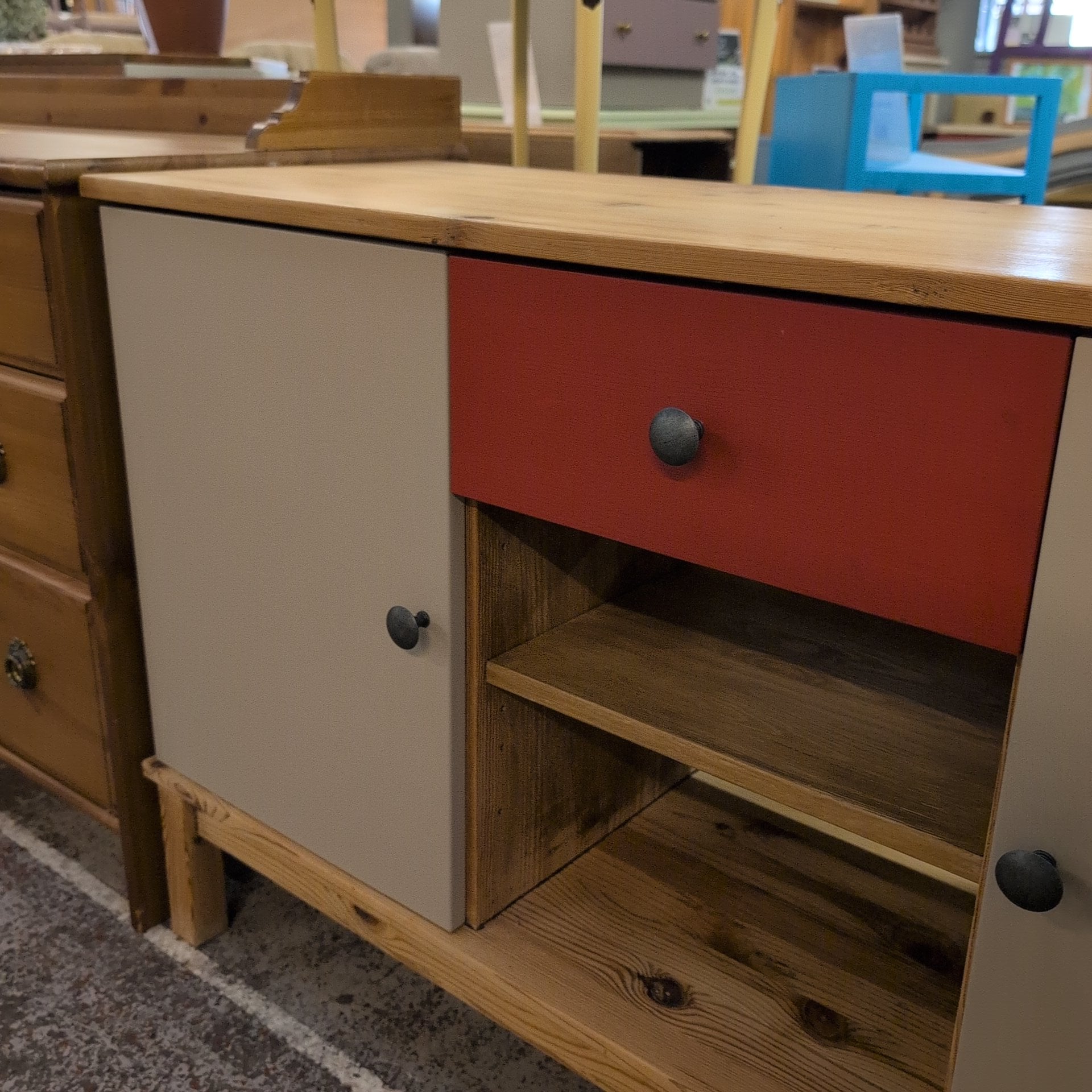 This beautifully upcycled sideboard showcases the transformative power of skilled craftsmanship. Our volunteer Jill has lovingly restored a classic piece, sanding back the wood to reveal its natural character before hand-painting it in striking coffee and red stripe tones using premium Autentico paint. The result is a one-of-a-kind statement piece that brings warmth and personality to any room. Perfect for storage with genuine character, this sideboard proves that with care and creativity, timeless furniture can be given a vibrant new life.