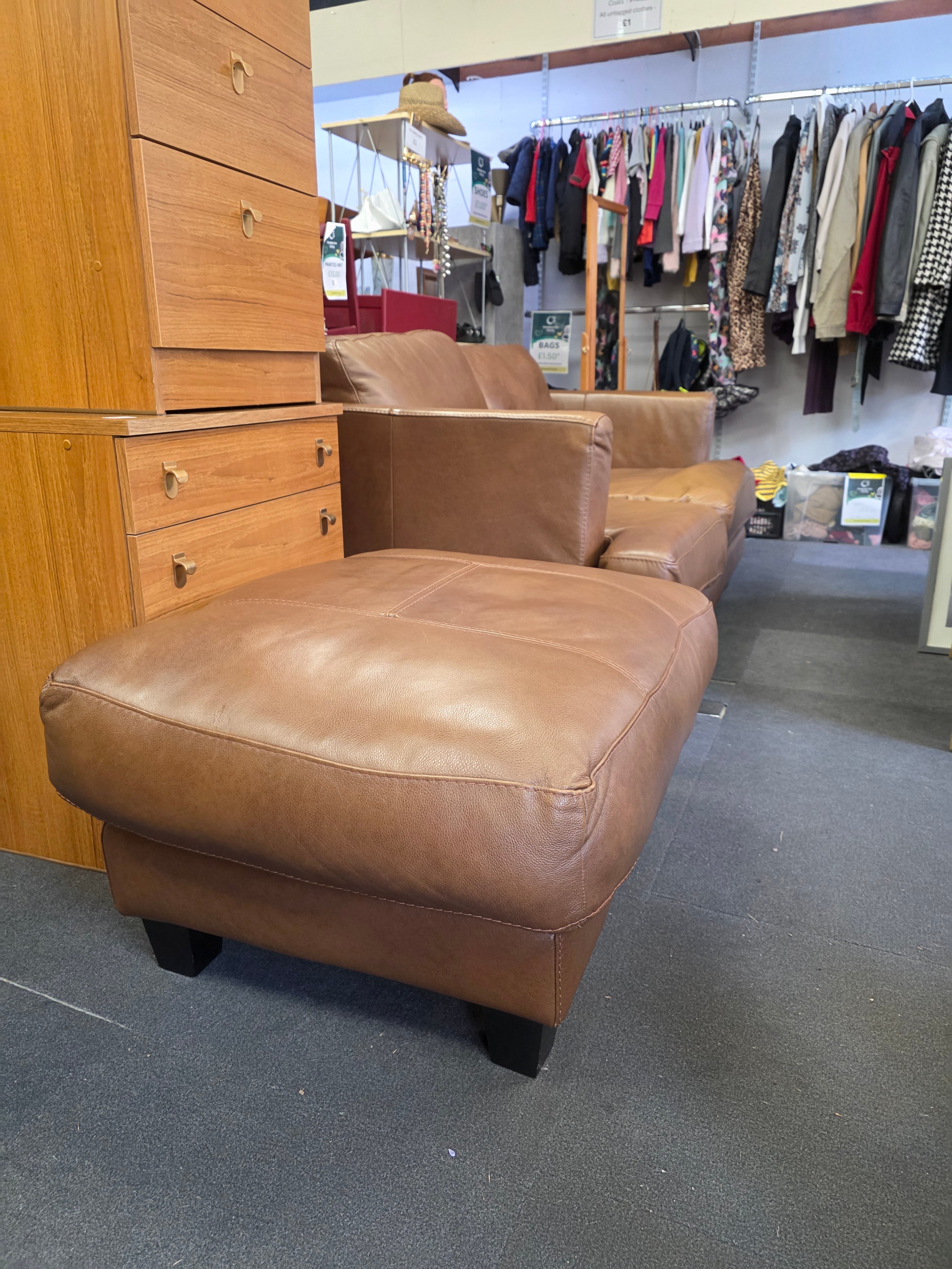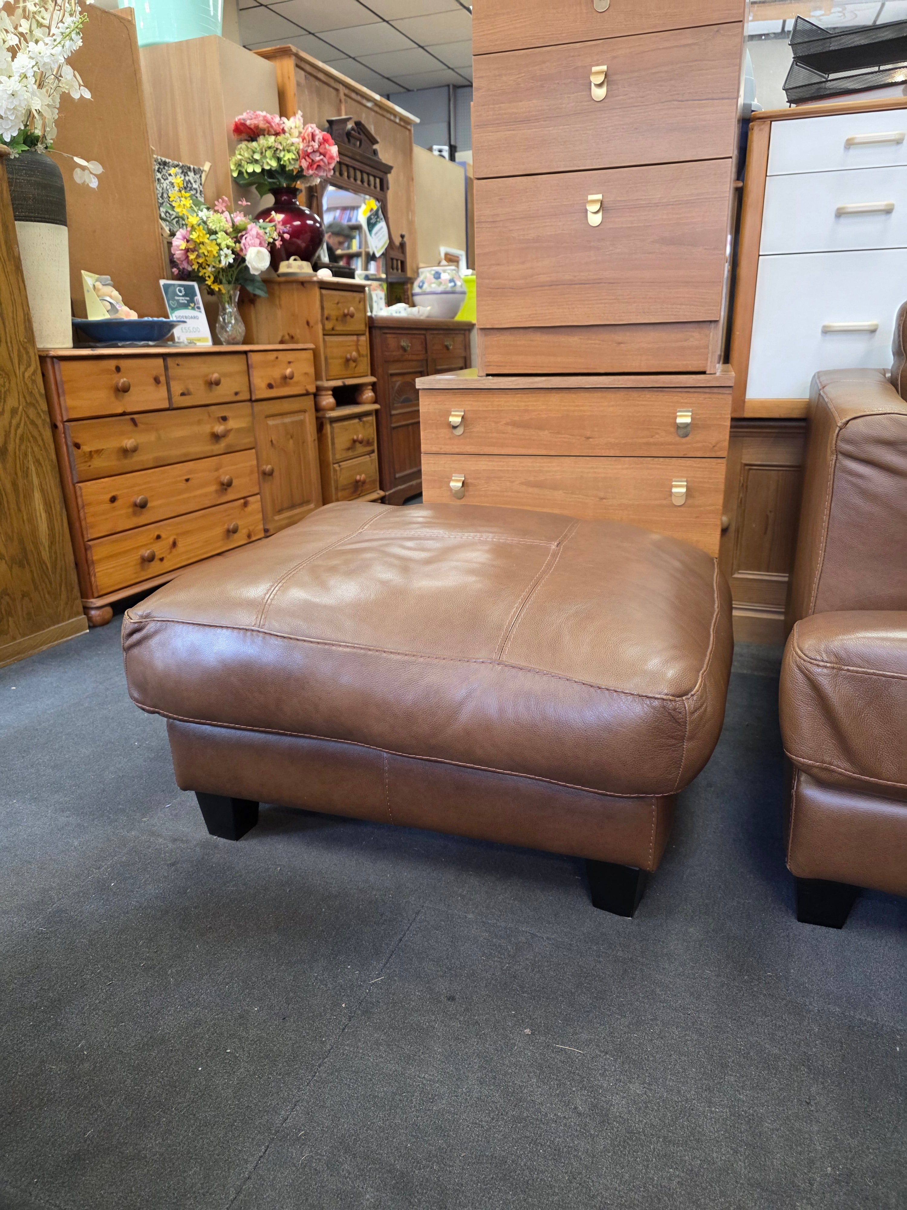 We are pleased to present a distinguished two-seater sofa crafted from rich brown leather. This elegant piece is accompanied by a perfectly matched footstool, offering an enhanced level of comfort. The supple leather promises a luxurious feel and a timeless aesthetic. Its design would complement a variety of interior styles. The seating is generously proportioned for two individuals. Imagine the relaxation and sophisticated ambiance this set could bring to your living space. It represents a blend of classic style and practical comfort. We believe this addition would be a truly valuable enhancement to any home.