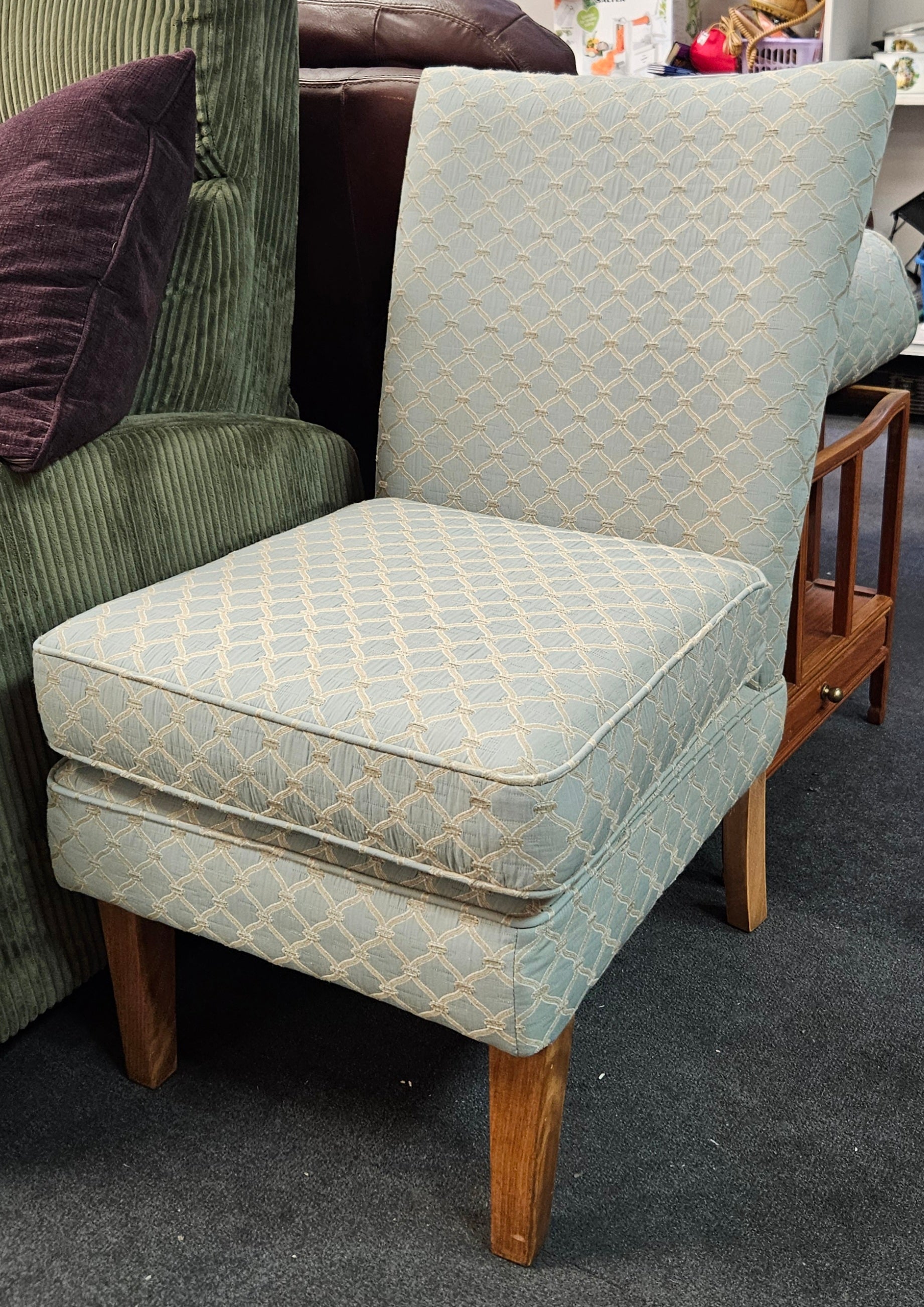 This bedroom chair, upholstered in a pale duck egg blue fabric, offers a calming aesthetic that enhances any interior design. Its thoughtful colour choice promotes a tranquil atmosphere, contributing to improved relaxation and a serene sleeping environment. Ideal for reading or unwinding, this chair seamlessly integrates style with functionality.