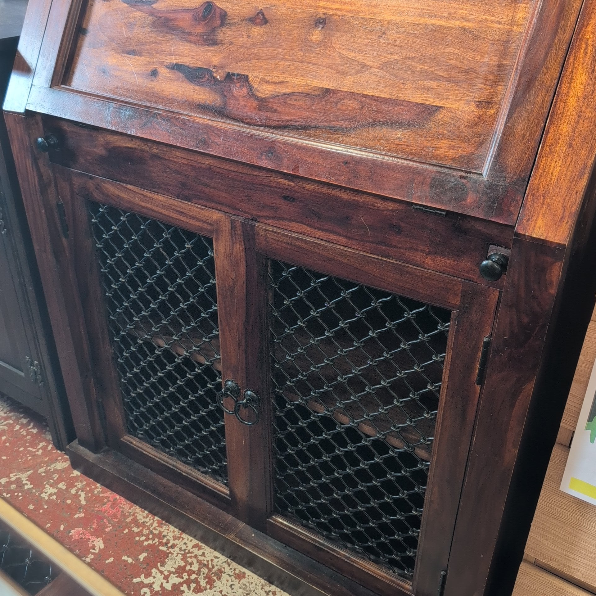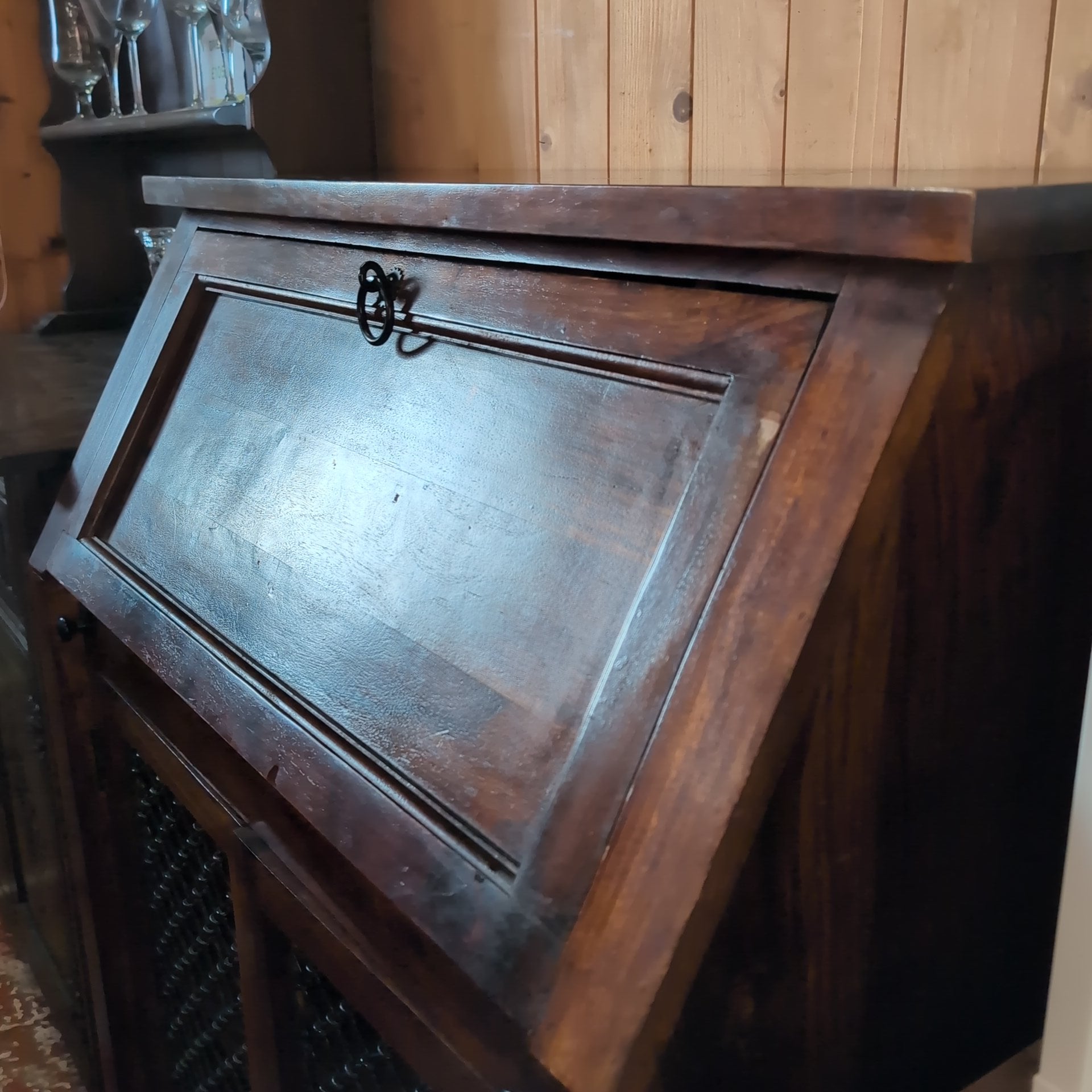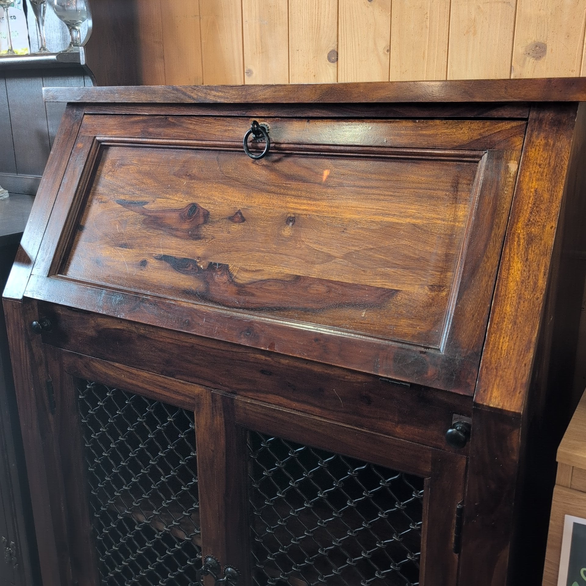This striking bureau combines contemporary design with substantial craftsmanship. Crafted from solid, heavy wood, it features distinctive iron detailing on the lower doors that anchors the modern aesthetic. The piece offers generous storage capacity throughout—deep compartments in the base provide ample room for larger items, whilst the upper section includes multiple smaller compartments ideal for organising documents, accessories, and everyday essentials. A versatile addition to any room, this bureau balances form and function with the quality construction you'd expect from artisanal furniture.