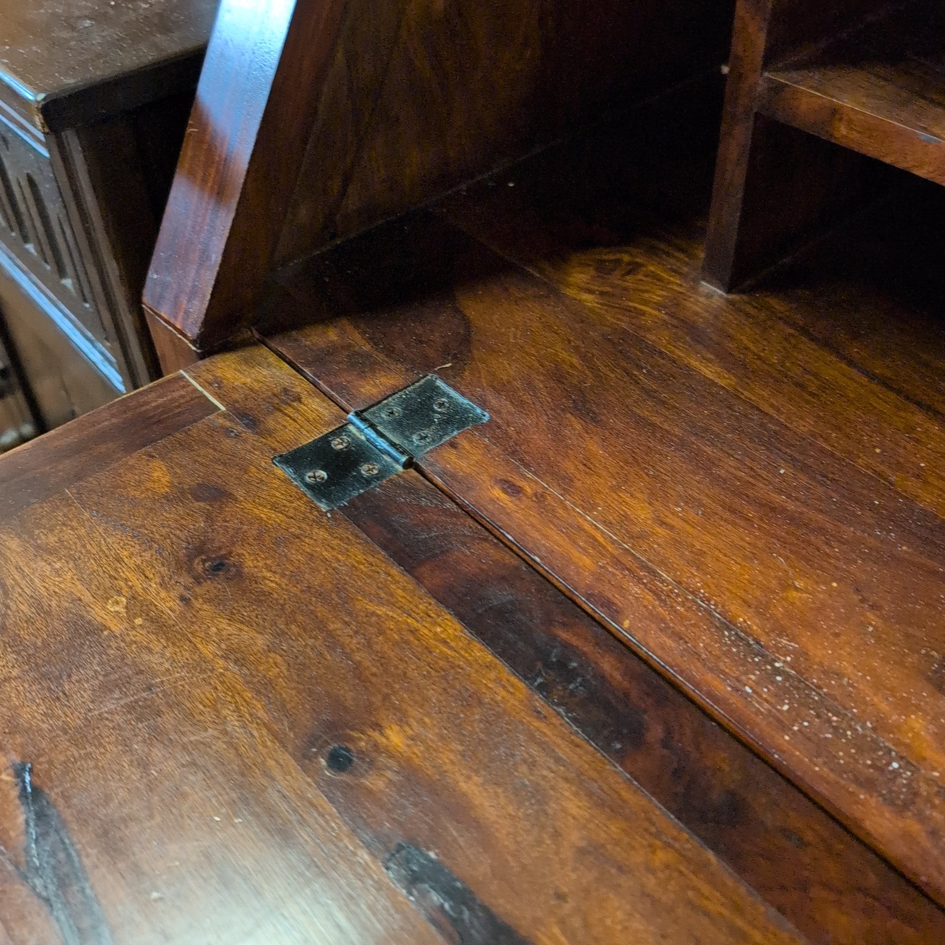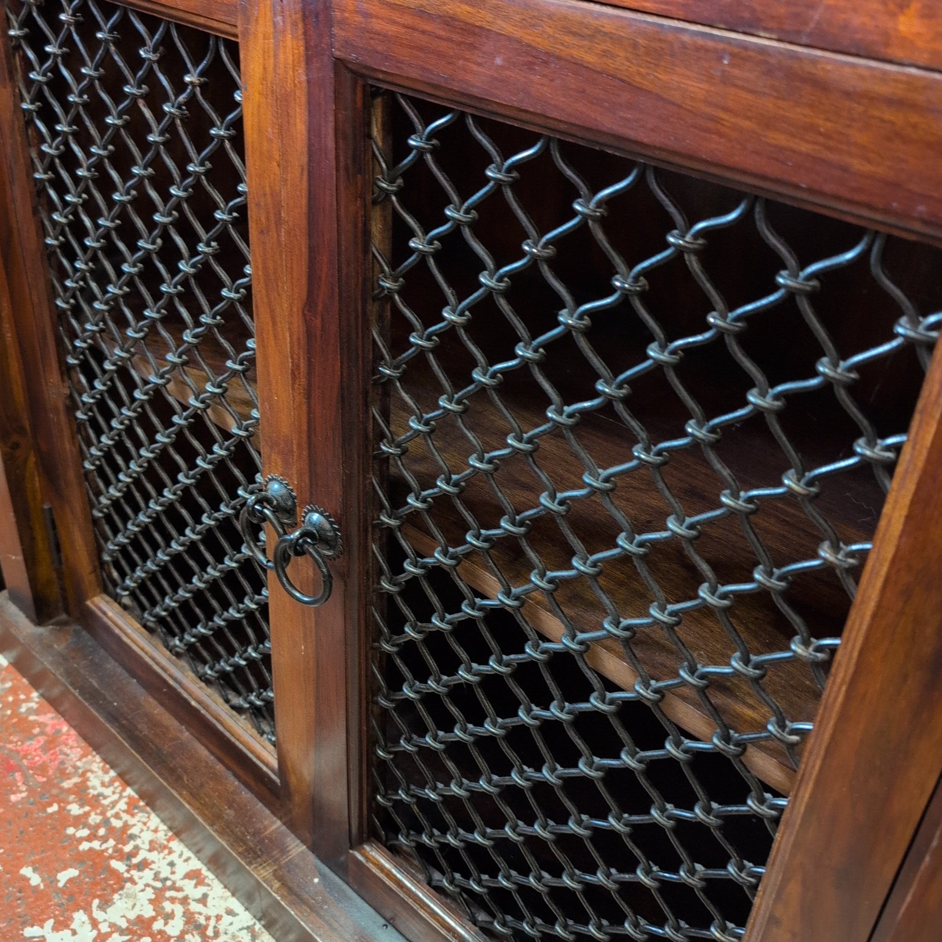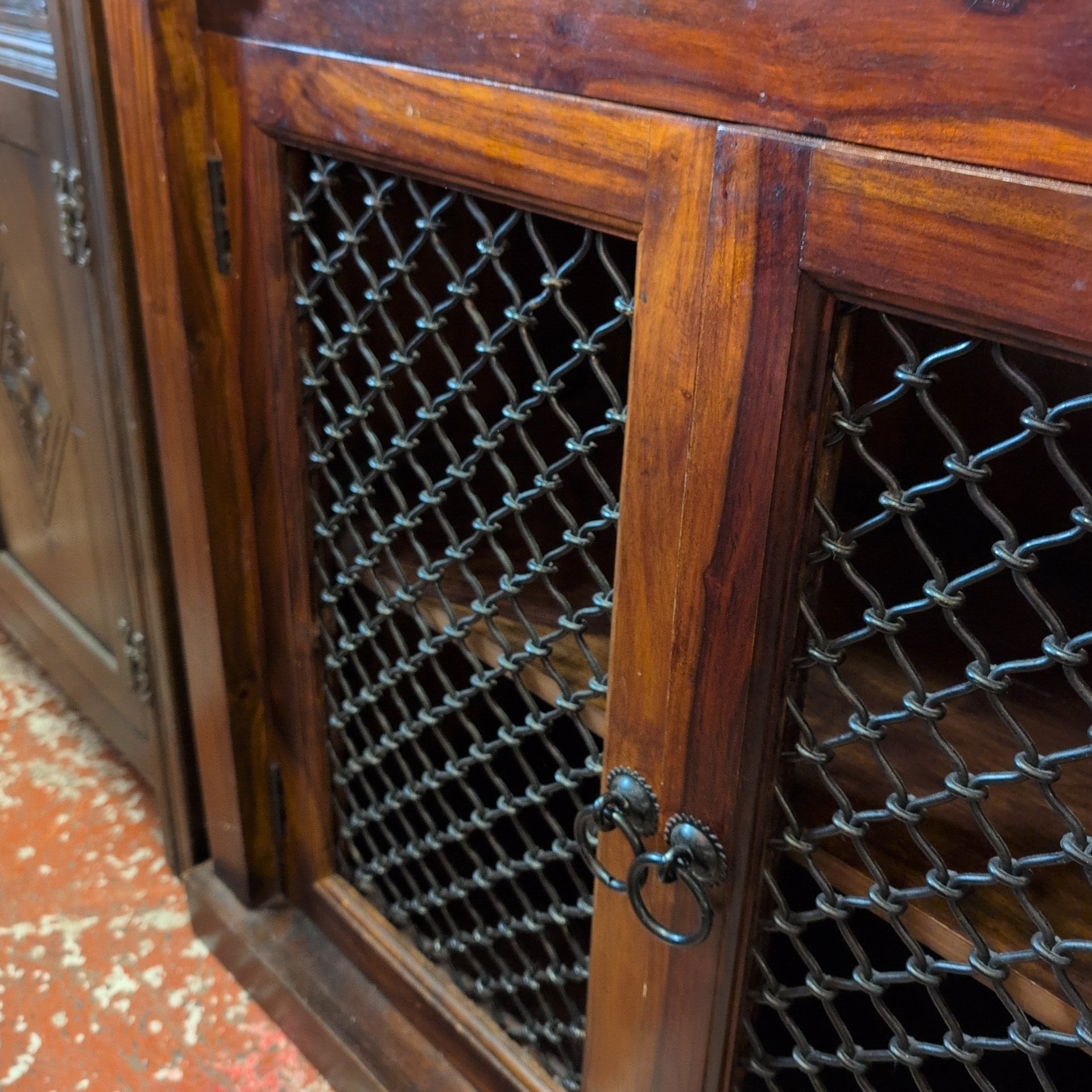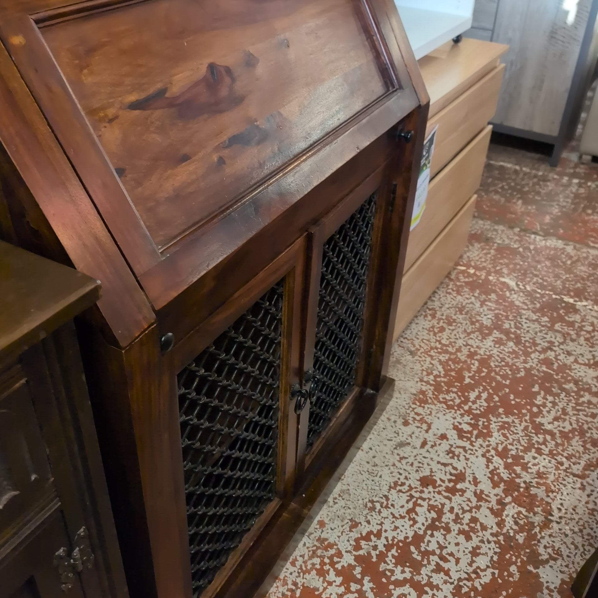 This striking bureau combines contemporary design with substantial craftsmanship. Crafted from solid, heavy wood, it features distinctive iron detailing on the lower doors that anchors the modern aesthetic. The piece offers generous storage capacity throughout—deep compartments in the base provide ample room for larger items, whilst the upper section includes multiple smaller compartments ideal for organising documents, accessories, and everyday essentials. A versatile addition to any room, this bureau balances form and function with the quality construction you'd expect from artisanal furniture.