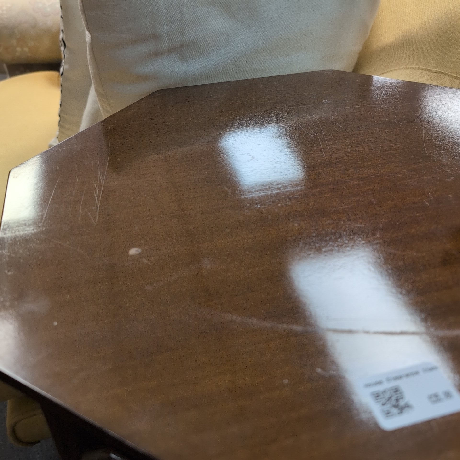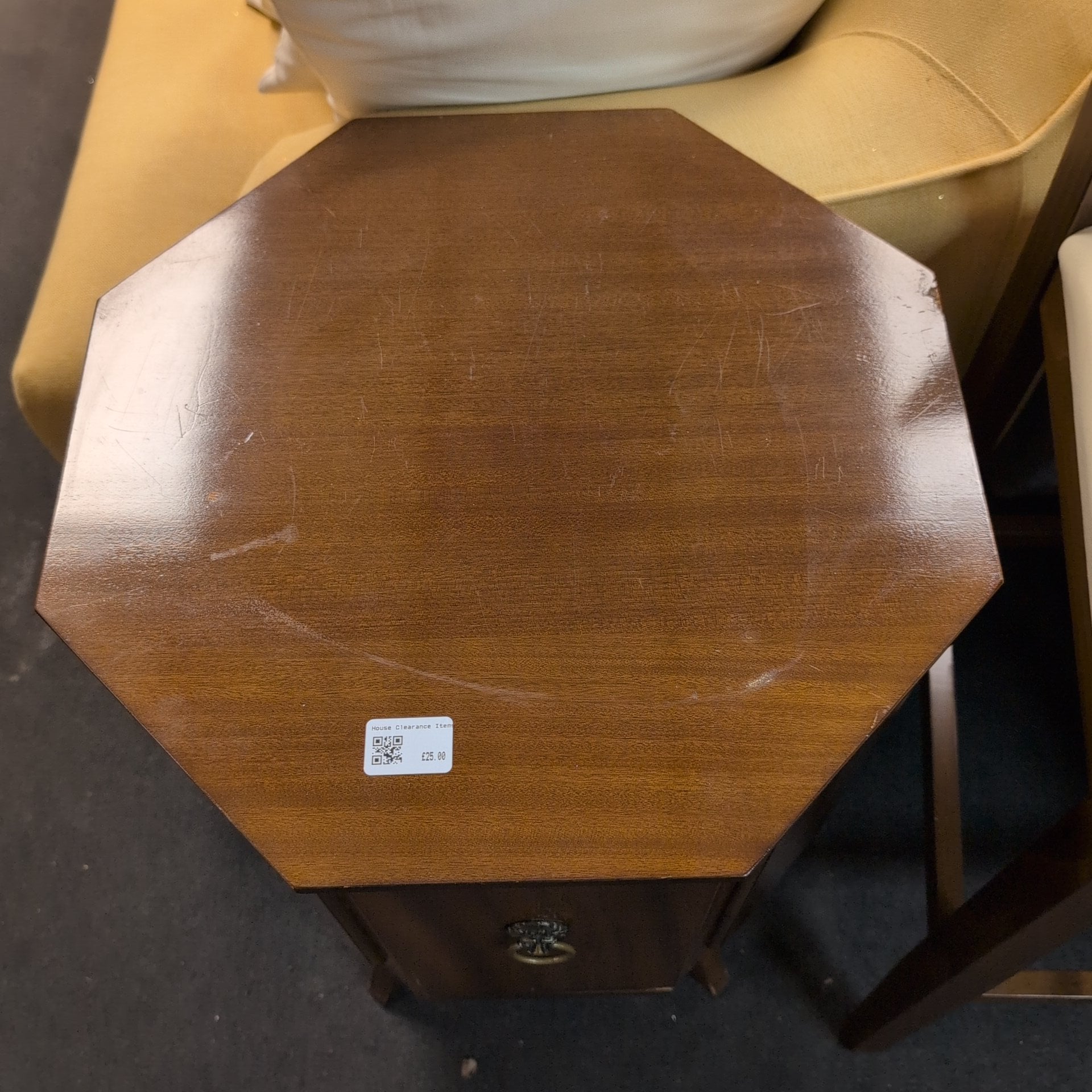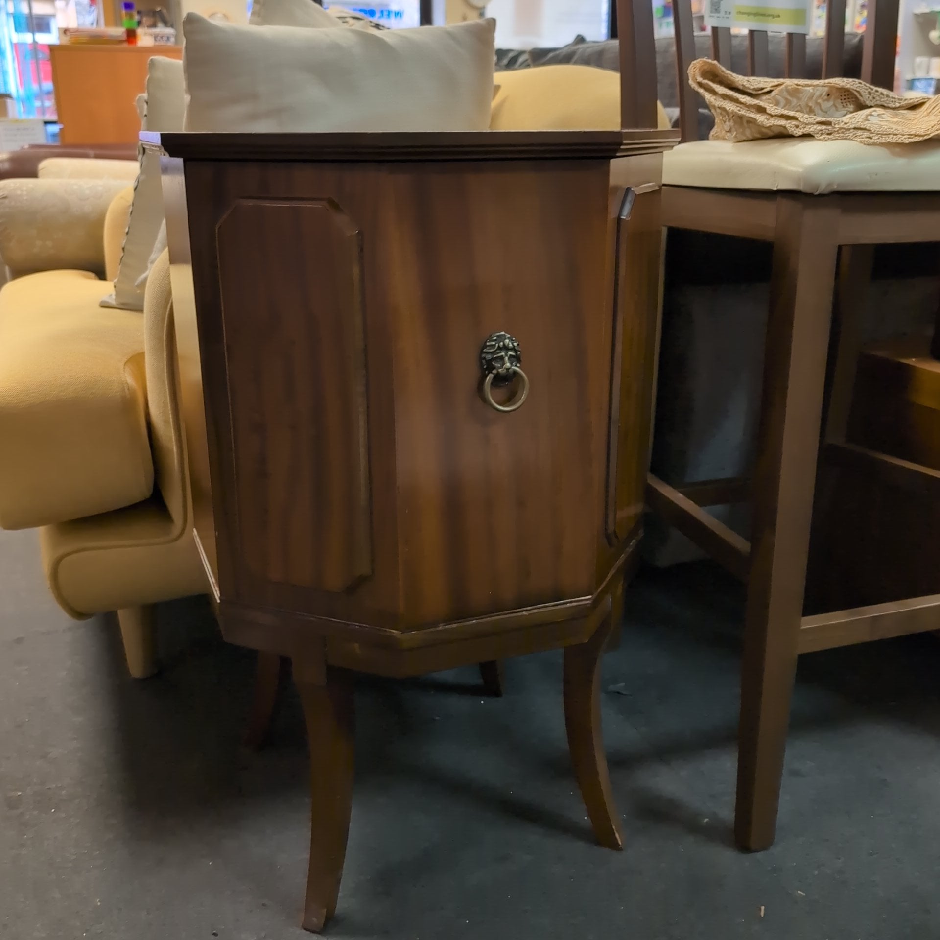 This wooden cabinet features a unique octagonal shape, providing both functional storage and aesthetic appeal. With a shelf inside, it offers convenient organization options for any room. Its sturdy construction ensures long-lasting use, making it a stylish and practical addition to any space.