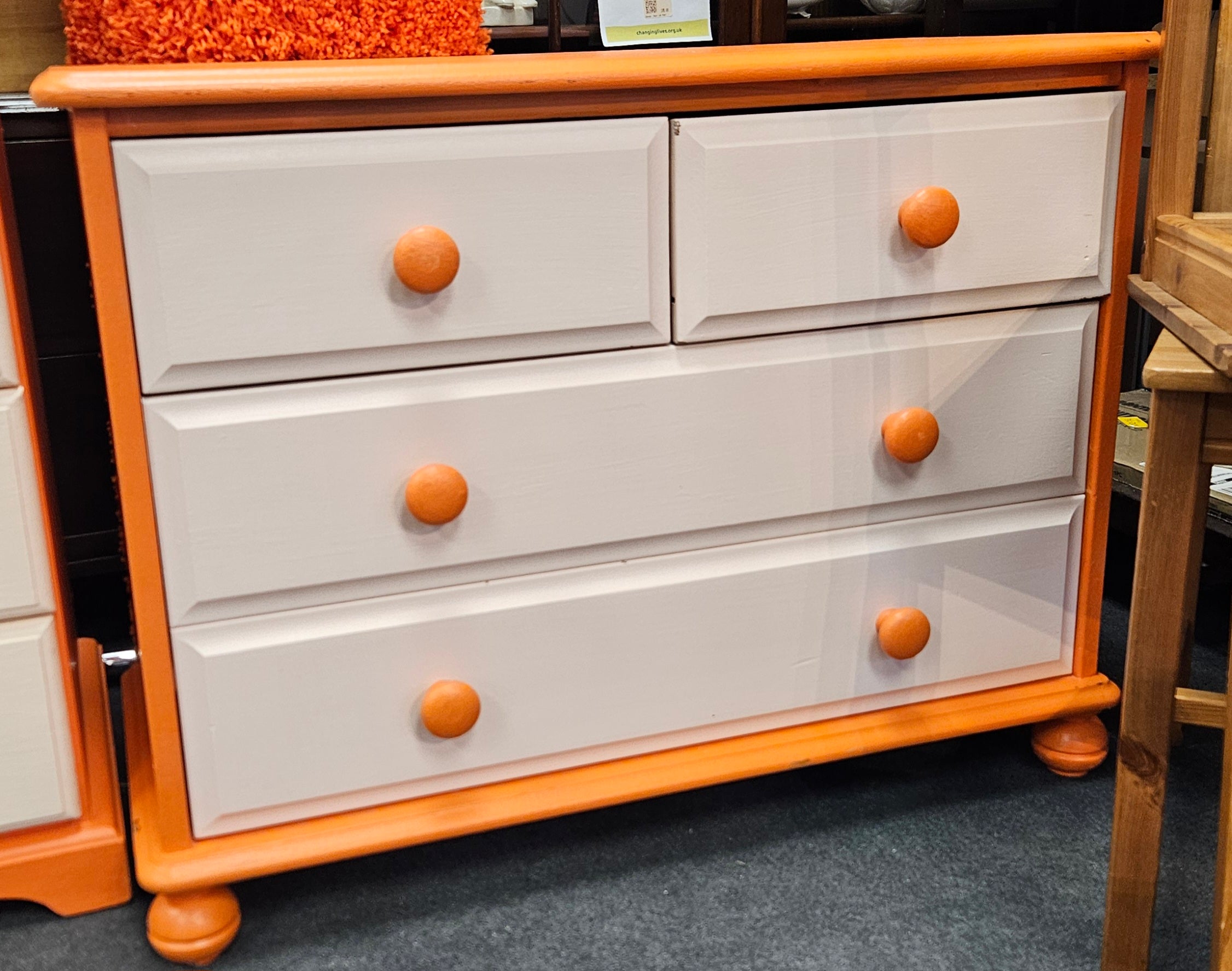 This chest of drawers boasts a beautifully painted orange exterior, perfect for adding a pop of color to any room. Crafted with expert precision, this piece will provide both style and functionality to your space.