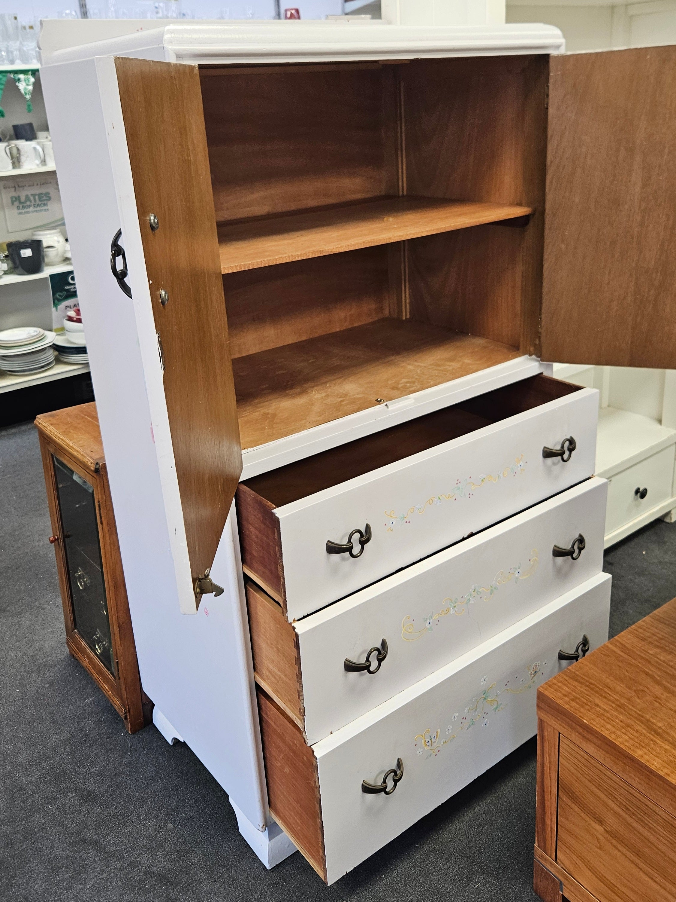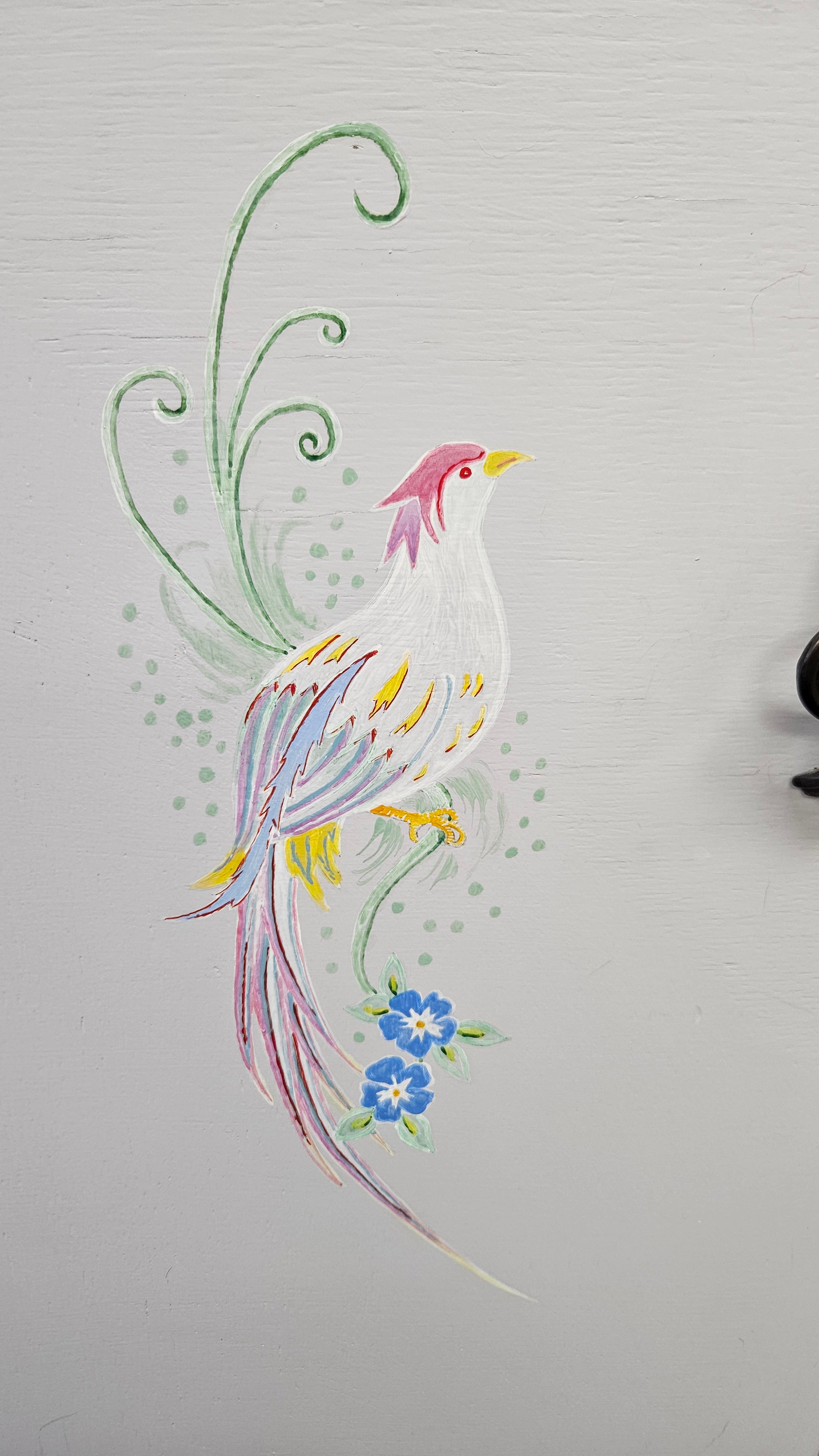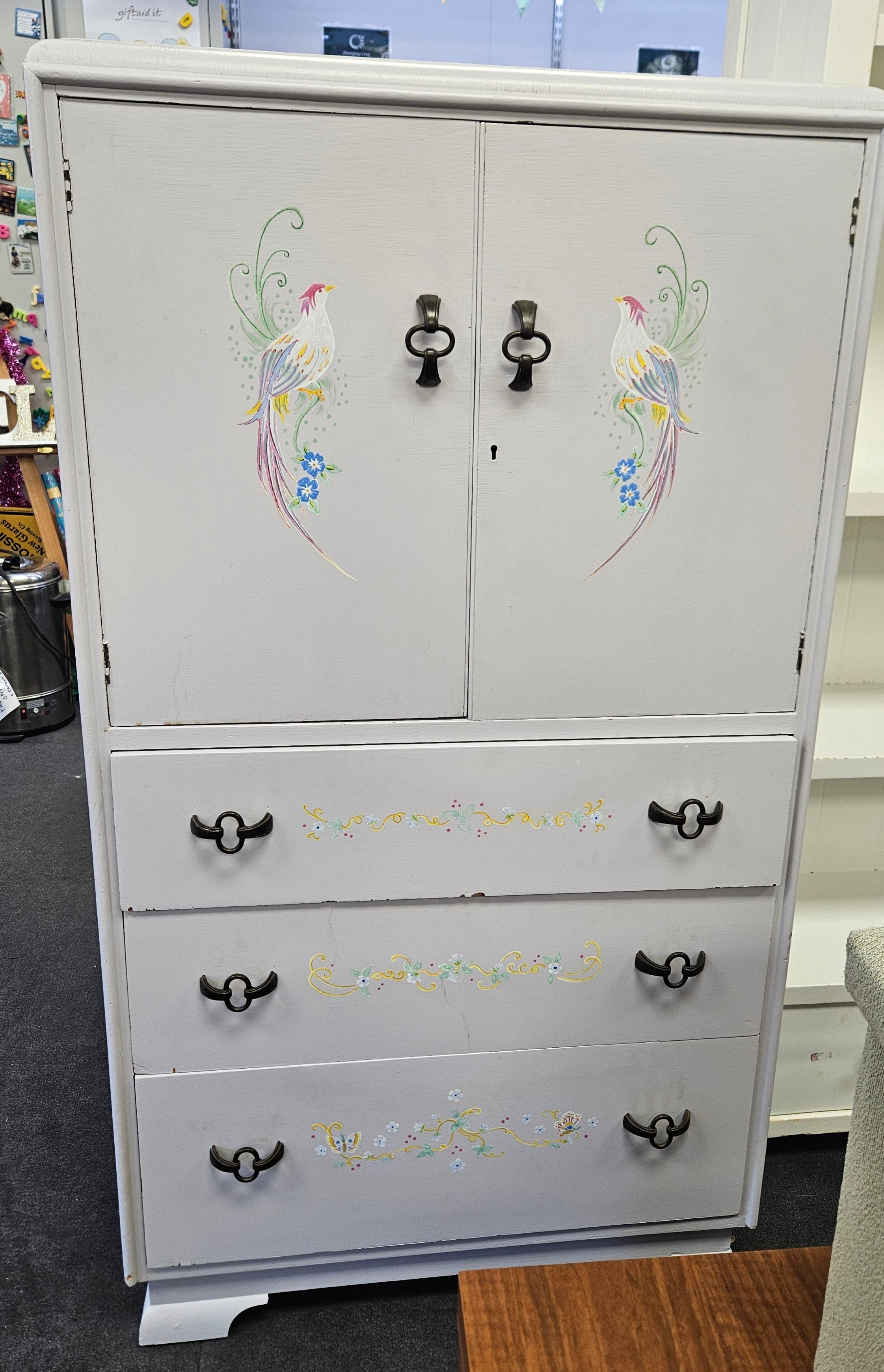 This beautifully painted cupboard features intricate designs of flowers and birds of paradise, adding a touch of elegance and charm to any space. Crafted with expert precision, it's a perfect addition to your home décor.