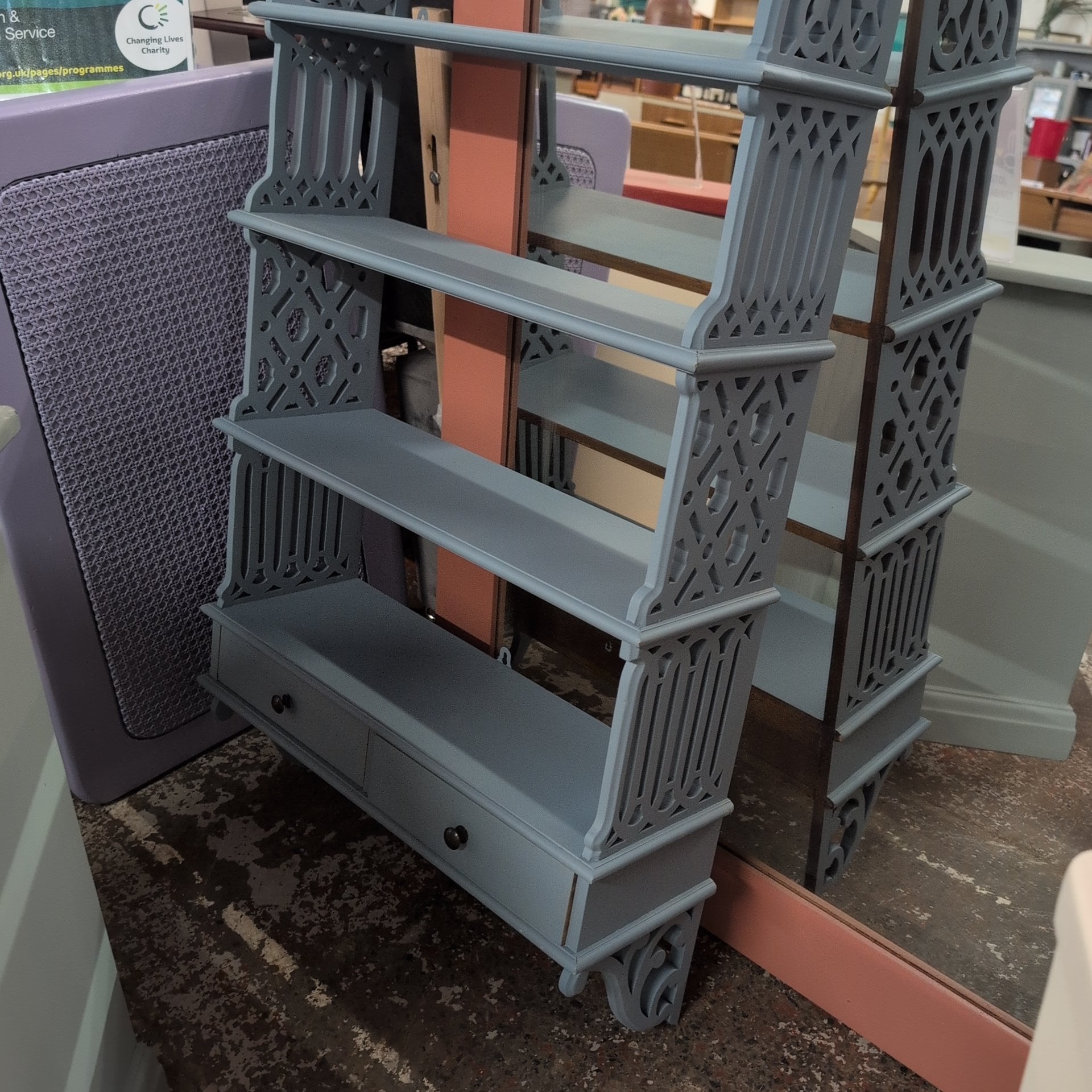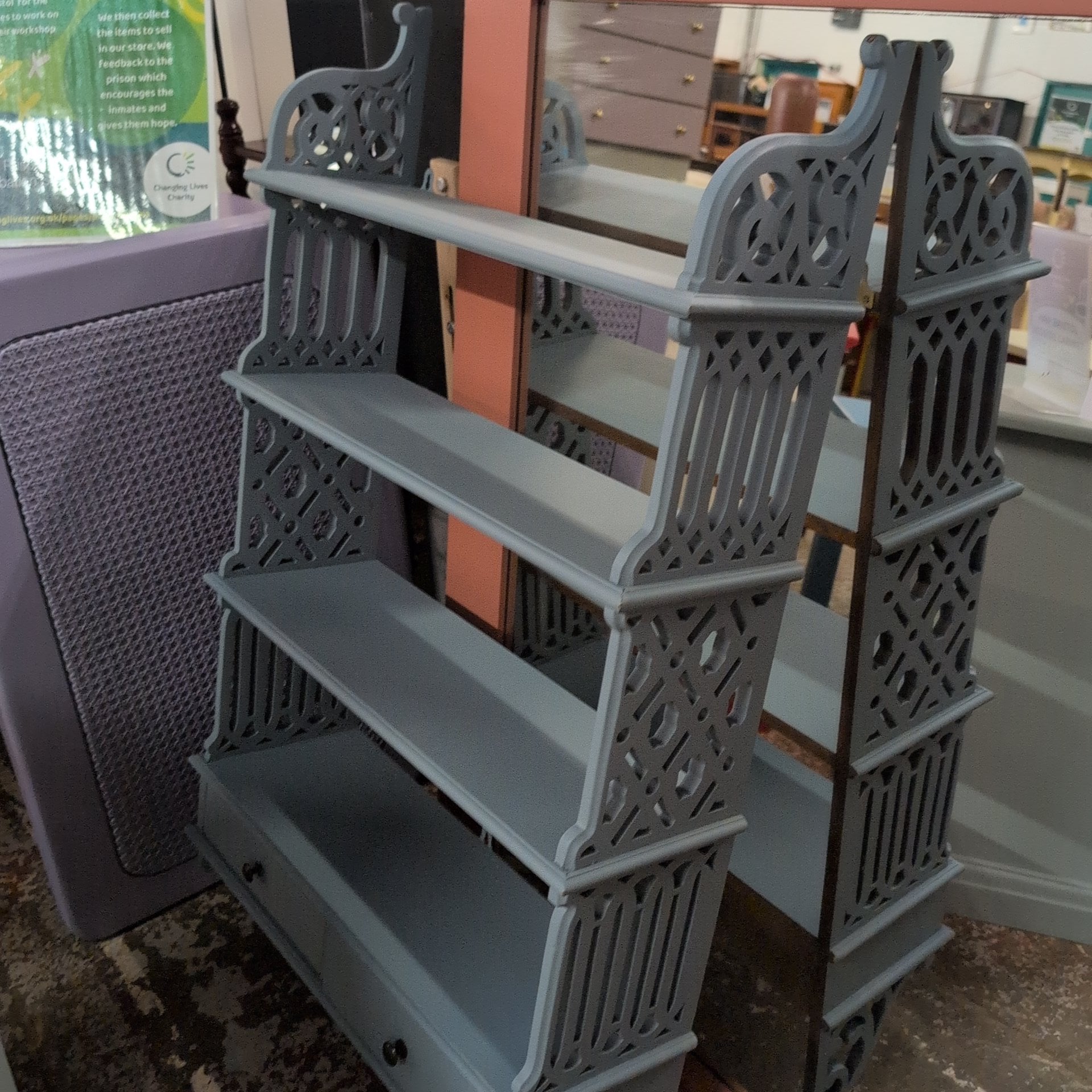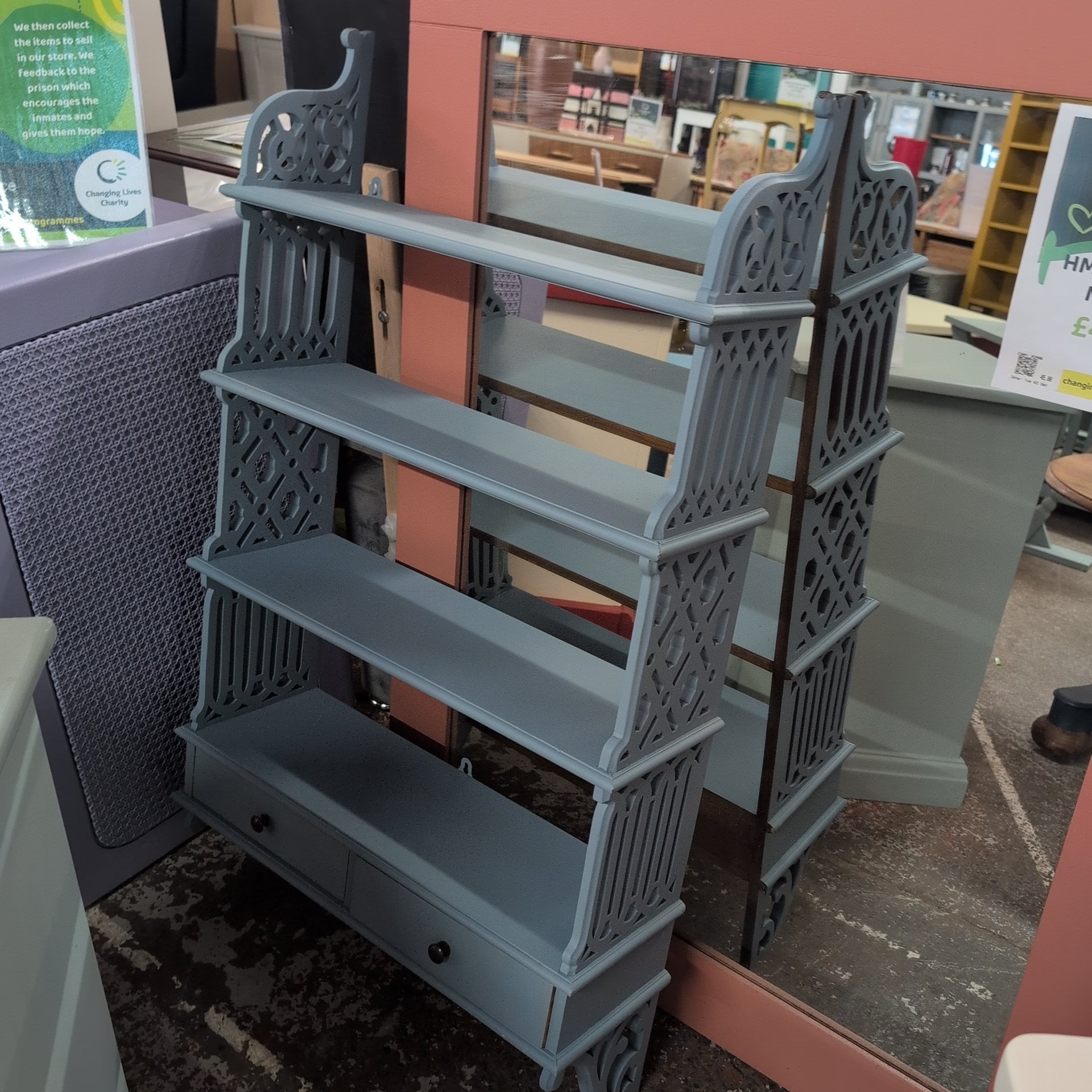 This striking four-tier hanging shelf is hand-painted in a serene blue finish by participants in the HMP Bristol programme. Each piece carries the care and craftsmanship of skilled artisans, making it a meaningful addition to any room. Perfect for displaying books, plants, or treasured objects, this shelf combines functional storage with genuine character. By choosing this piece, you're supporting rehabilitation and skill-building within the community.