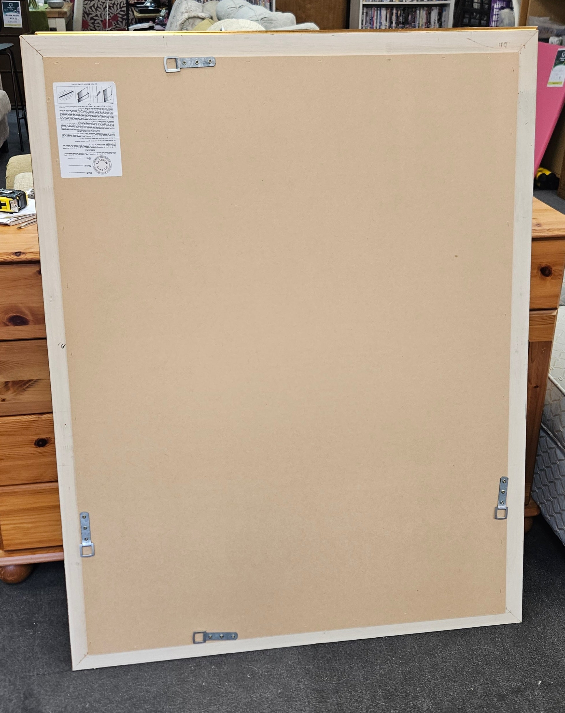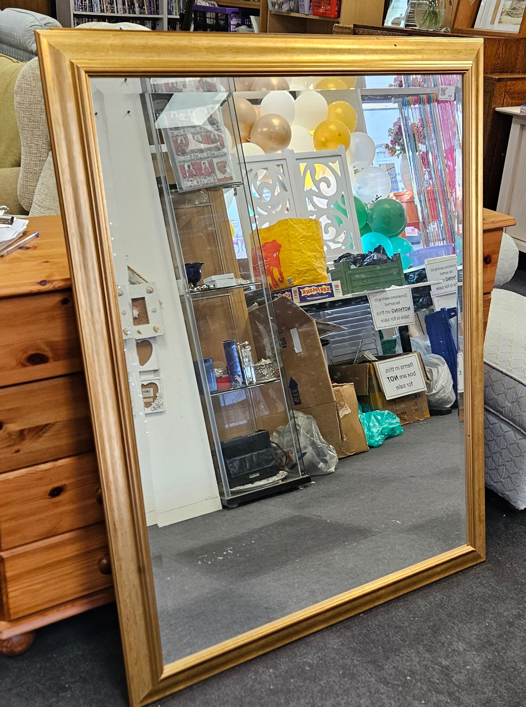 This large gold framed mirror serves as a functional and aesthetic addition to any space. Its substantial size enhances light reflection, contributing to a brighter environment, while the elegant gold frame adds a touch of sophistication. Ideal for both personal and professional settings, it combines style with utility.