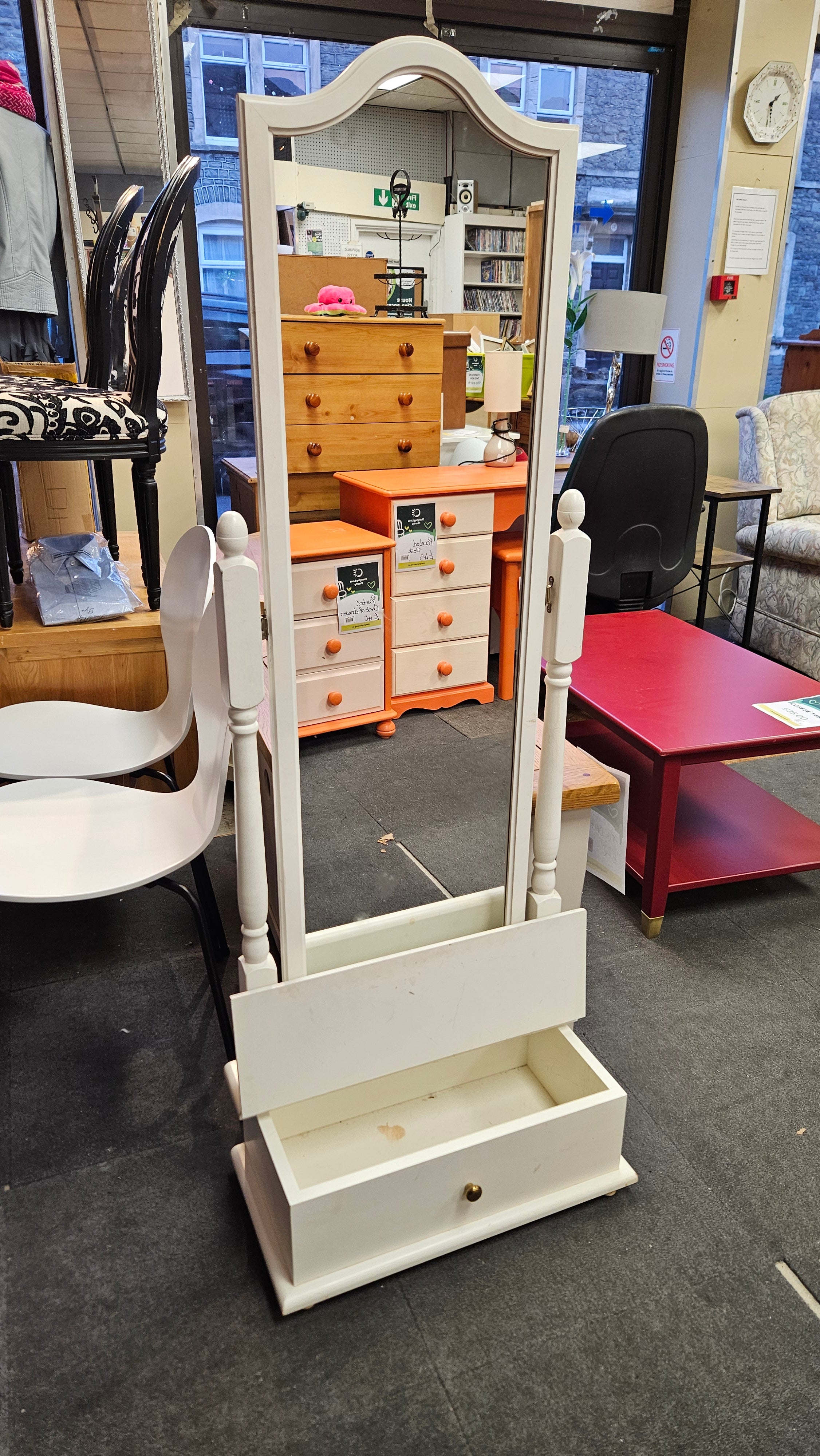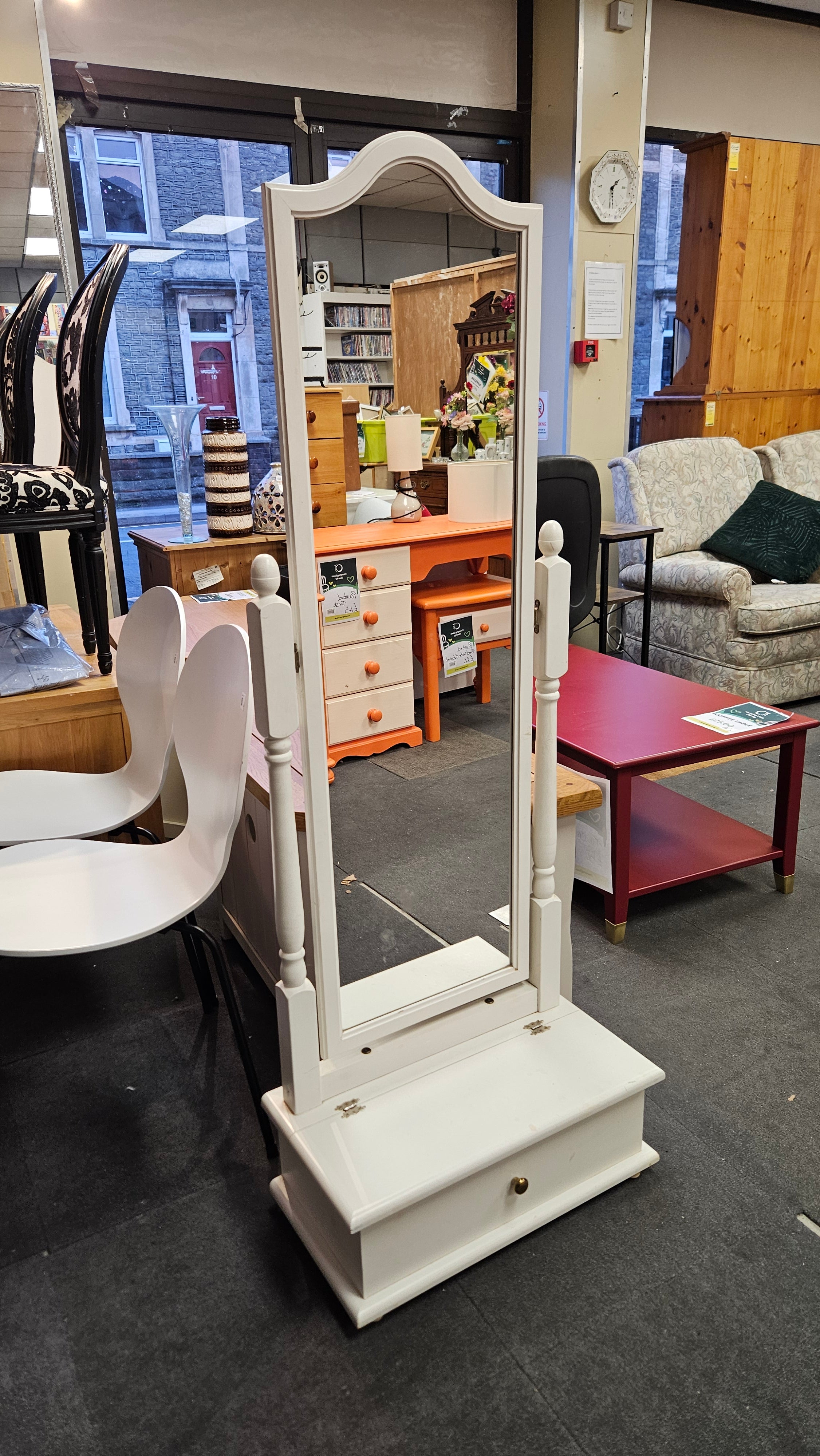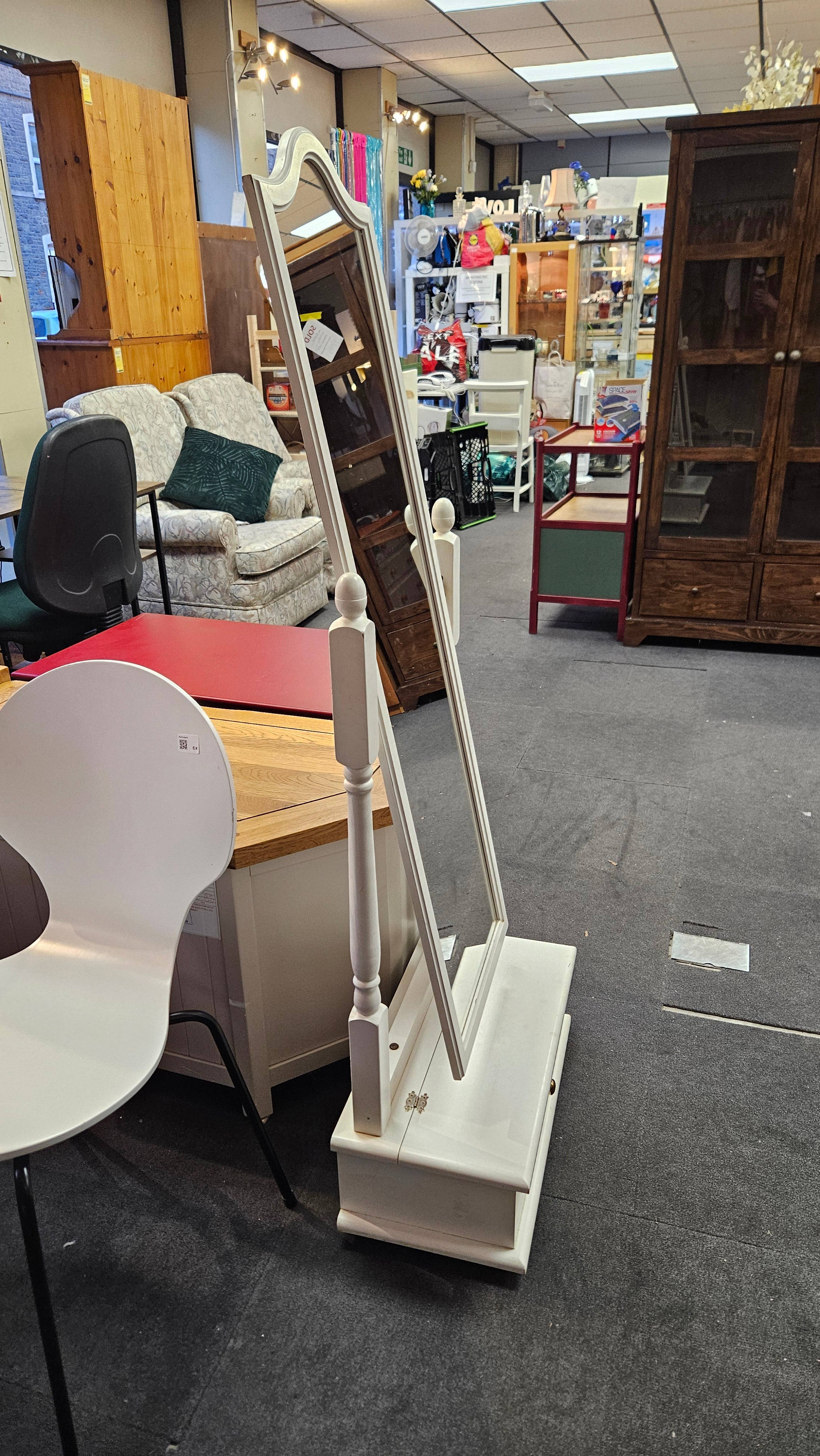 White framed mirror with lift up storage to base