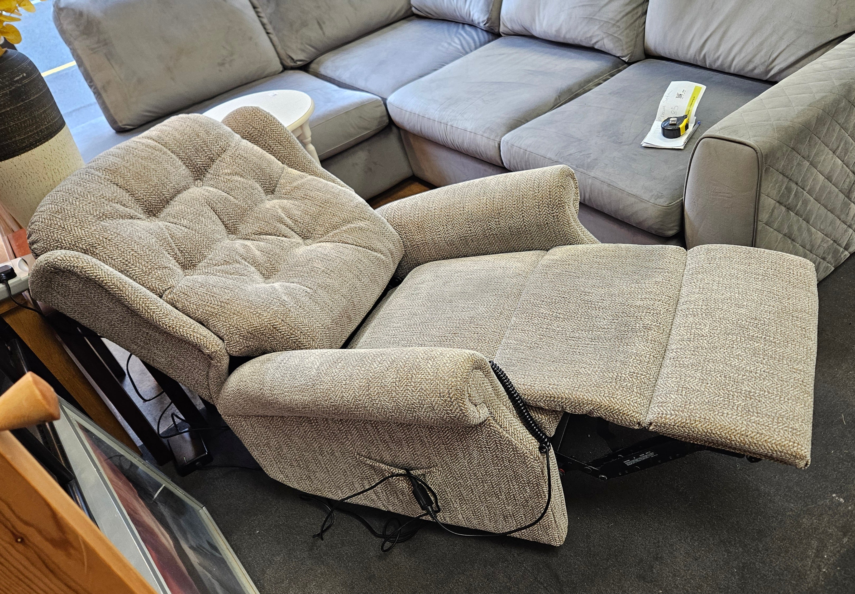 The Rise & Recline Chair features a durable grey herringbone fabric, providing both aesthetic appeal and comfort. Its rise and recline functionality enhances accessibility, making it suitable for individuals with mobility challenges. This chair combines style with practical ergonomic support, promoting better posture and relaxation.