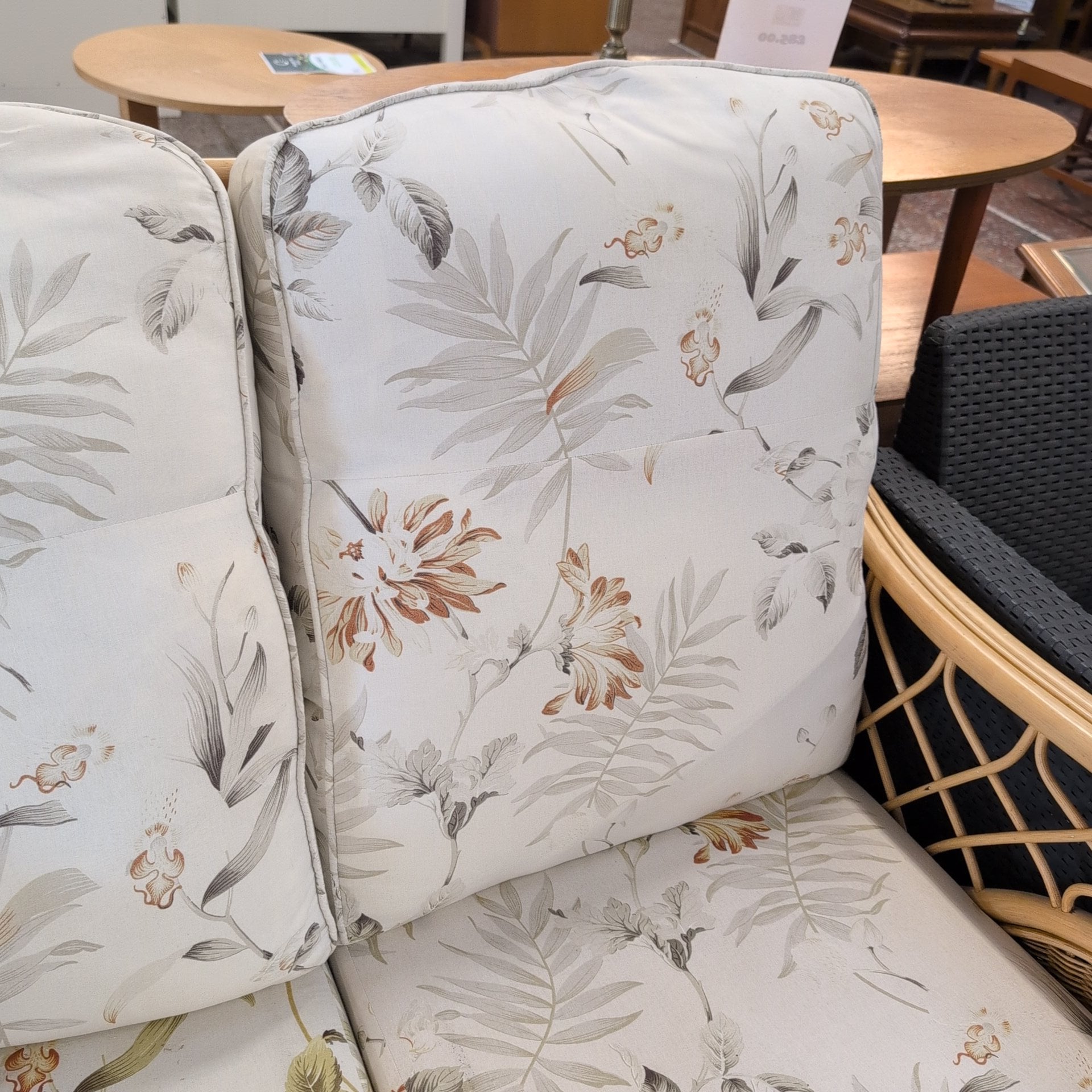 This two-seater sofa features a durable wicker frame that offers both strength and natural elegance. It comes with floral-patterned cushions, providing comfortable seating while adding a touch of classic charm to any indoor or outdoor space. Ideal for lounging or entertaining, this sofa combines aesthetic appeal with functionality for versatile use.