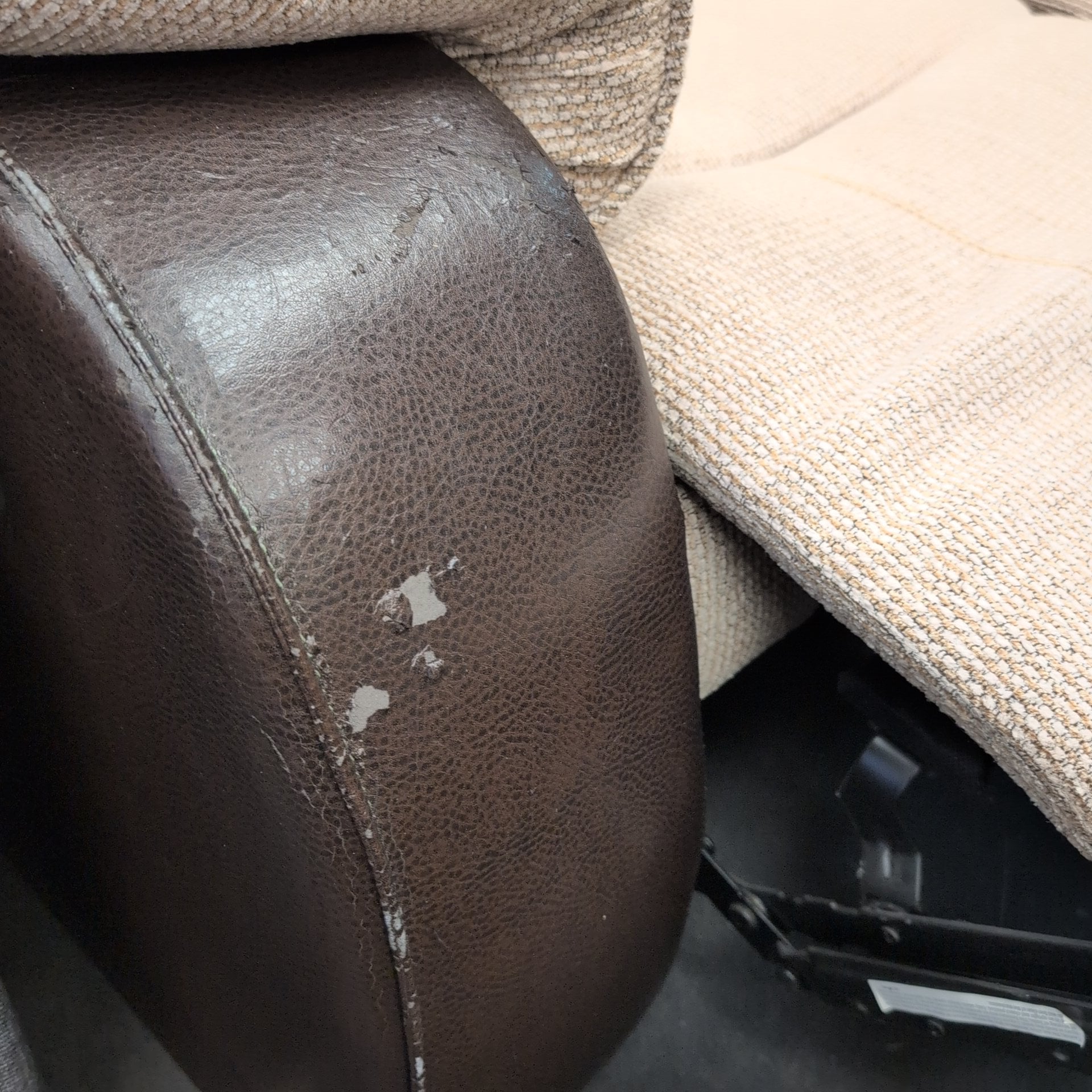 This manual reclining sofa features cream fabric upholstery with soft cushions for enhanced comfort. Its sturdy frame is crafted from brown faux leather, combining durability with style. The sofa offers adjustable reclining positions for personalised relaxation. Please note, as shown in the images, there are some marks on the sides of the frame. Ideal for creating a cosy and functional living space.