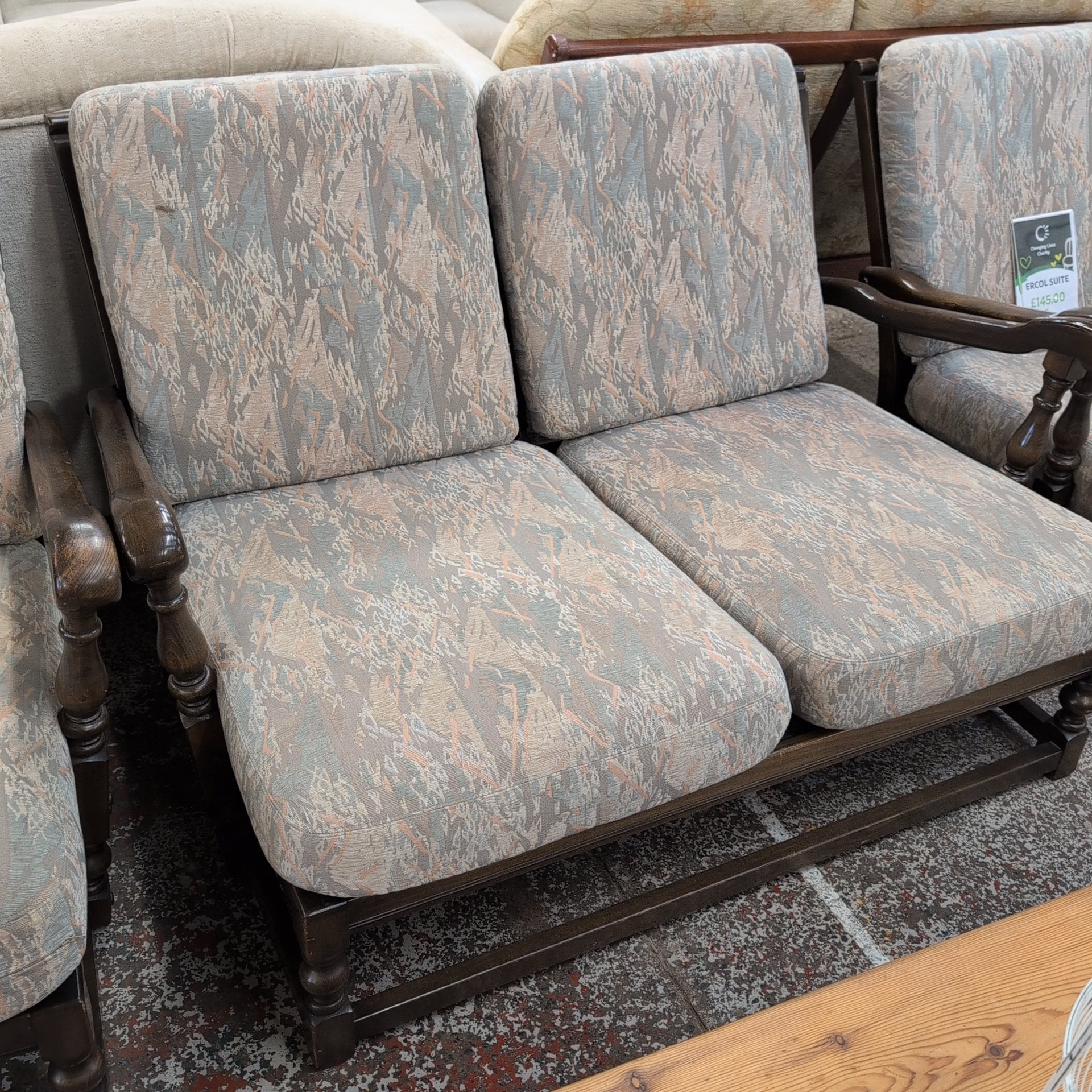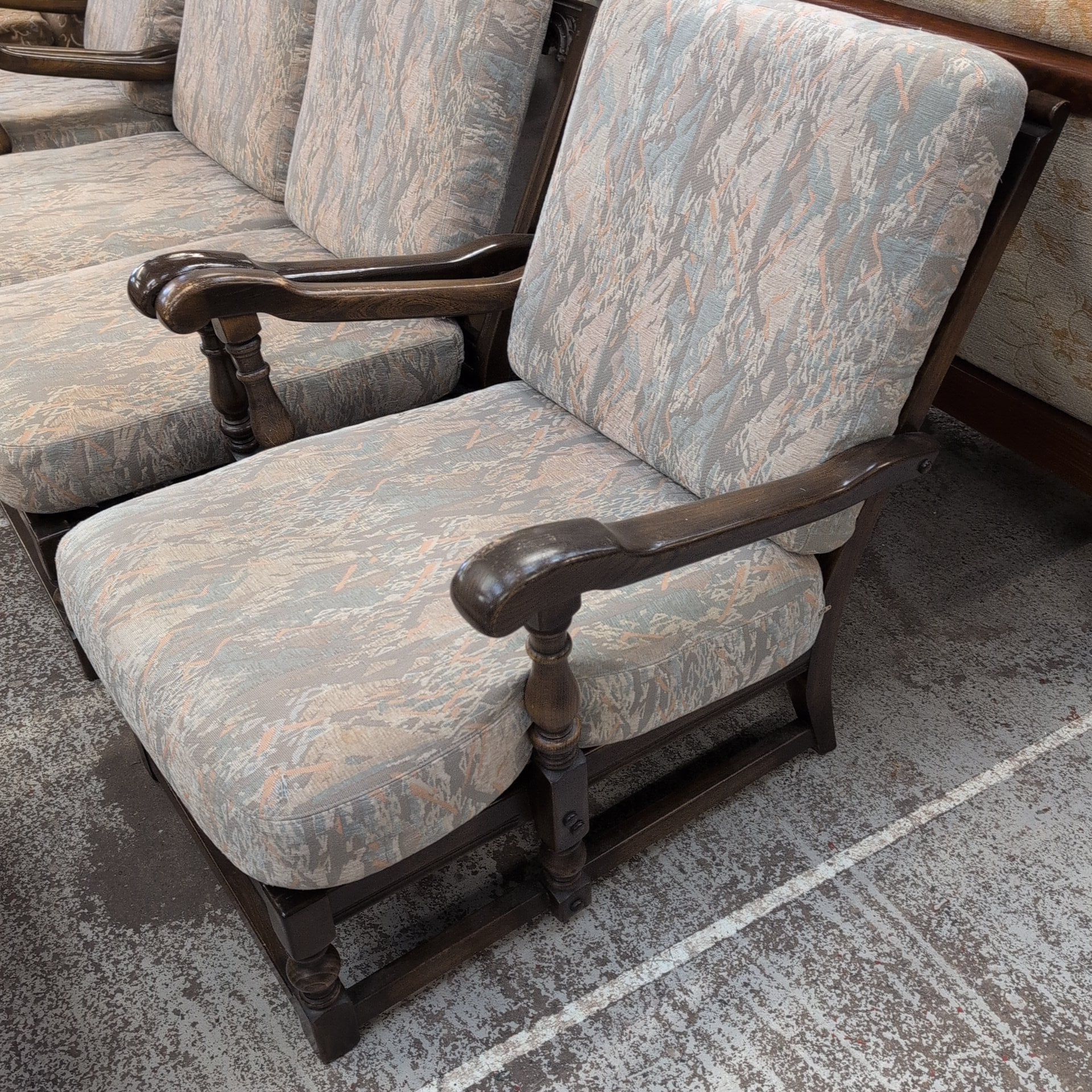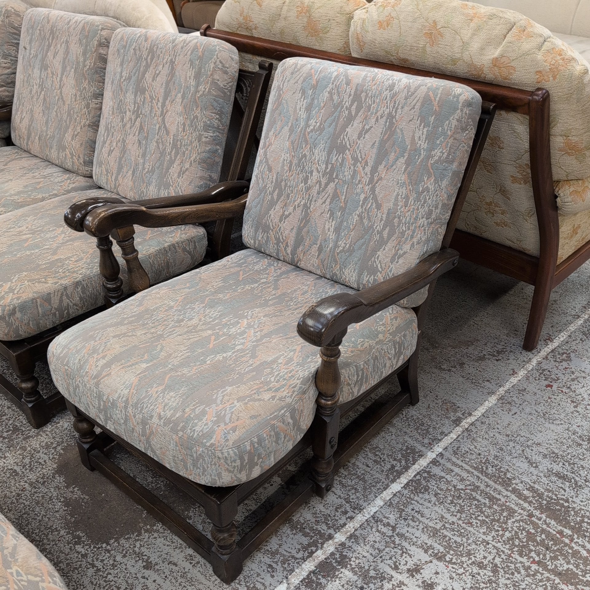 This Ercol cottage suite offers a wooden frame, sofa, two chairs, and a footstool. The pale pastel-colored cushions provide ultimate comfort and elegance. Furnish your living space with style and sophistication.