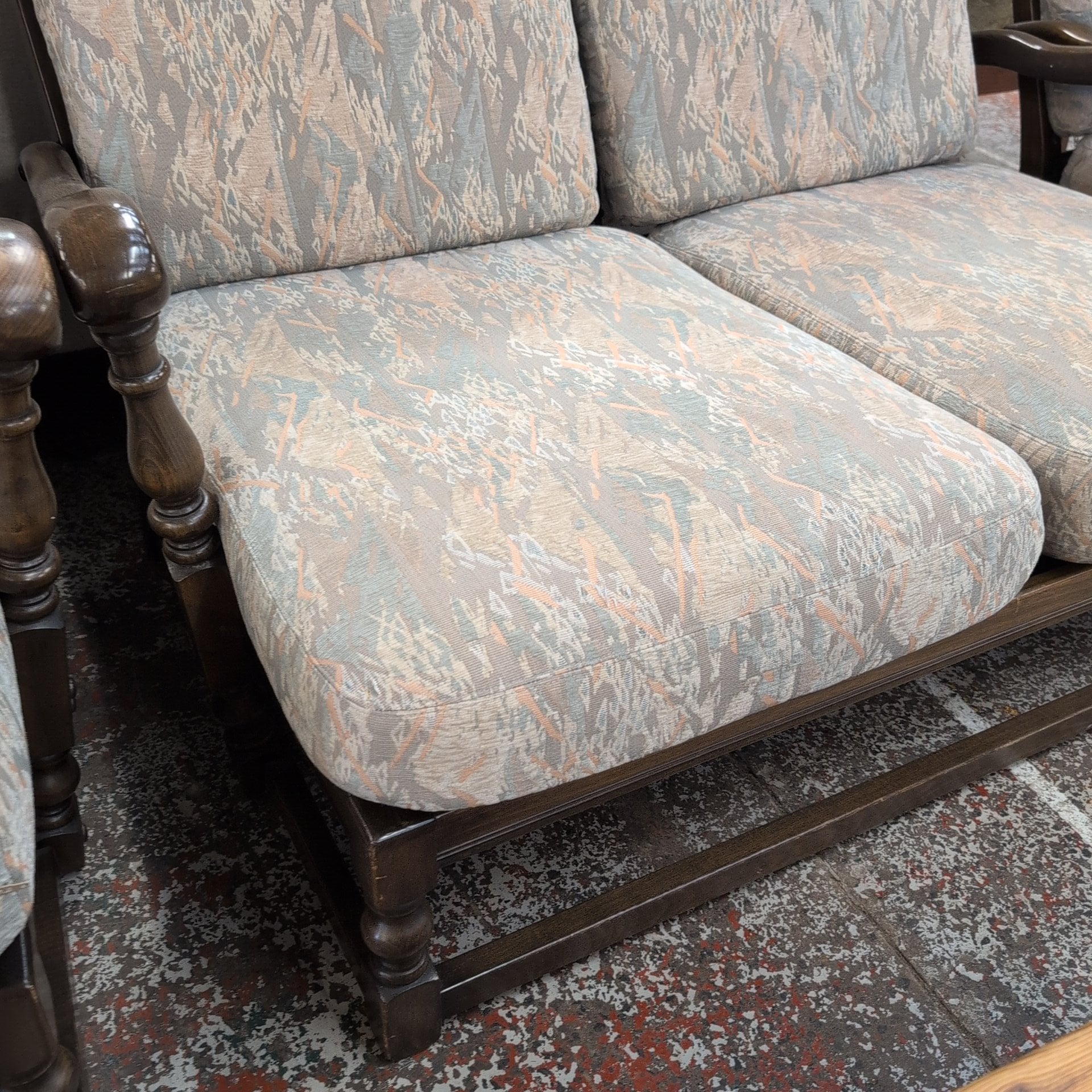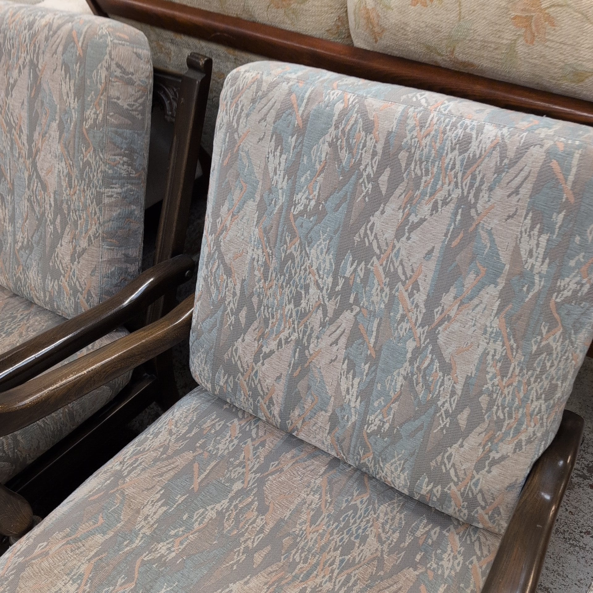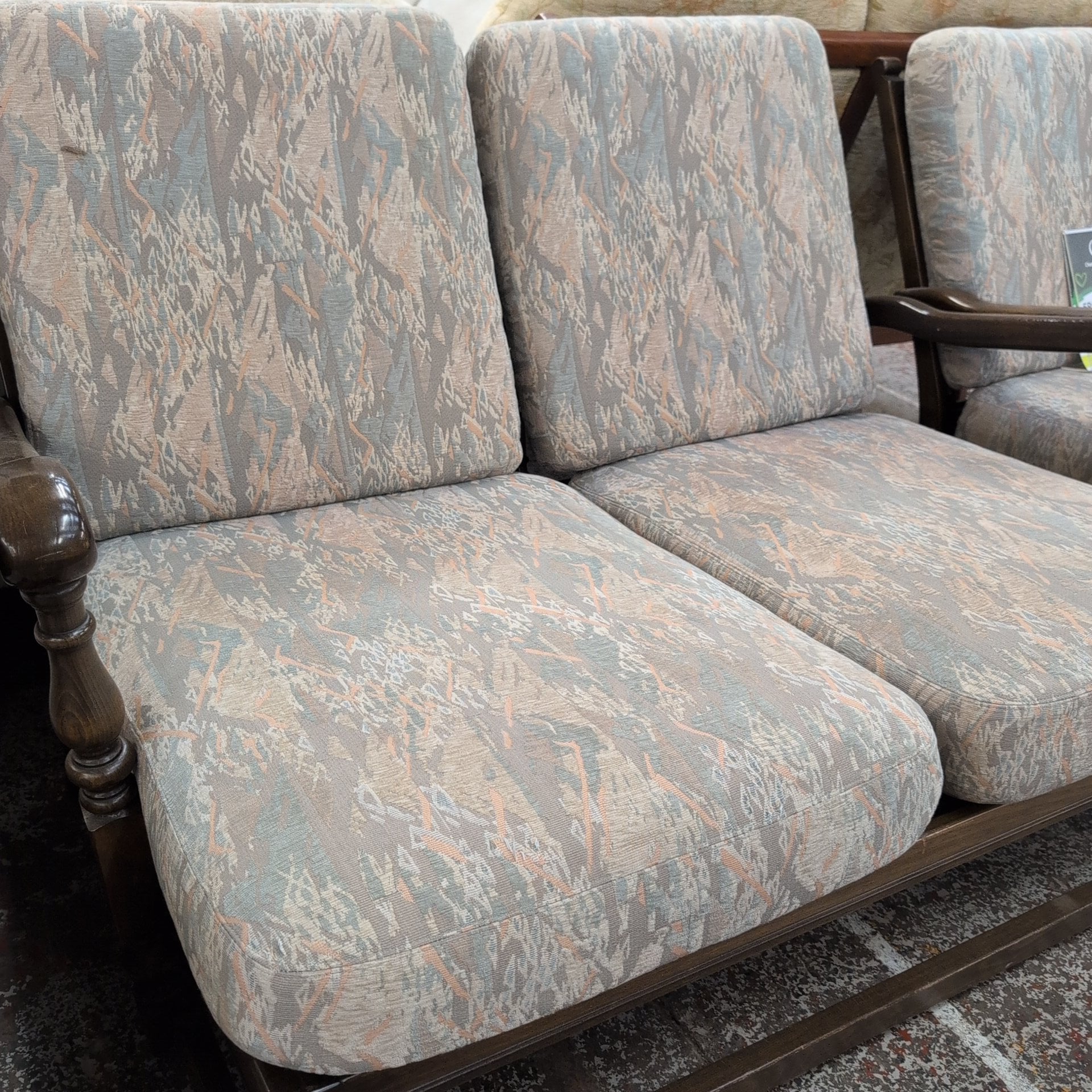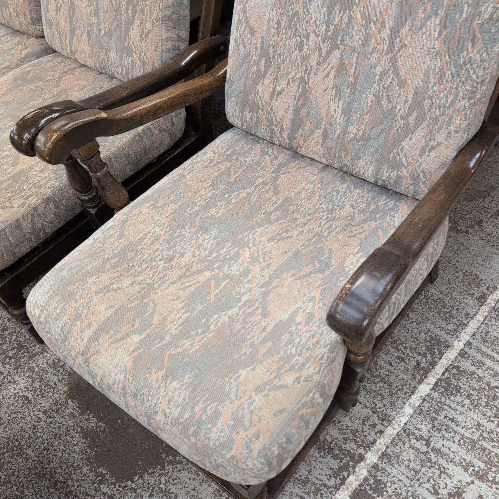 This Ercol cottage suite offers a wooden frame, sofa, two chairs, and a footstool. The pale pastel-colored cushions provide ultimate comfort and elegance. Furnish your living space with style and sophistication.