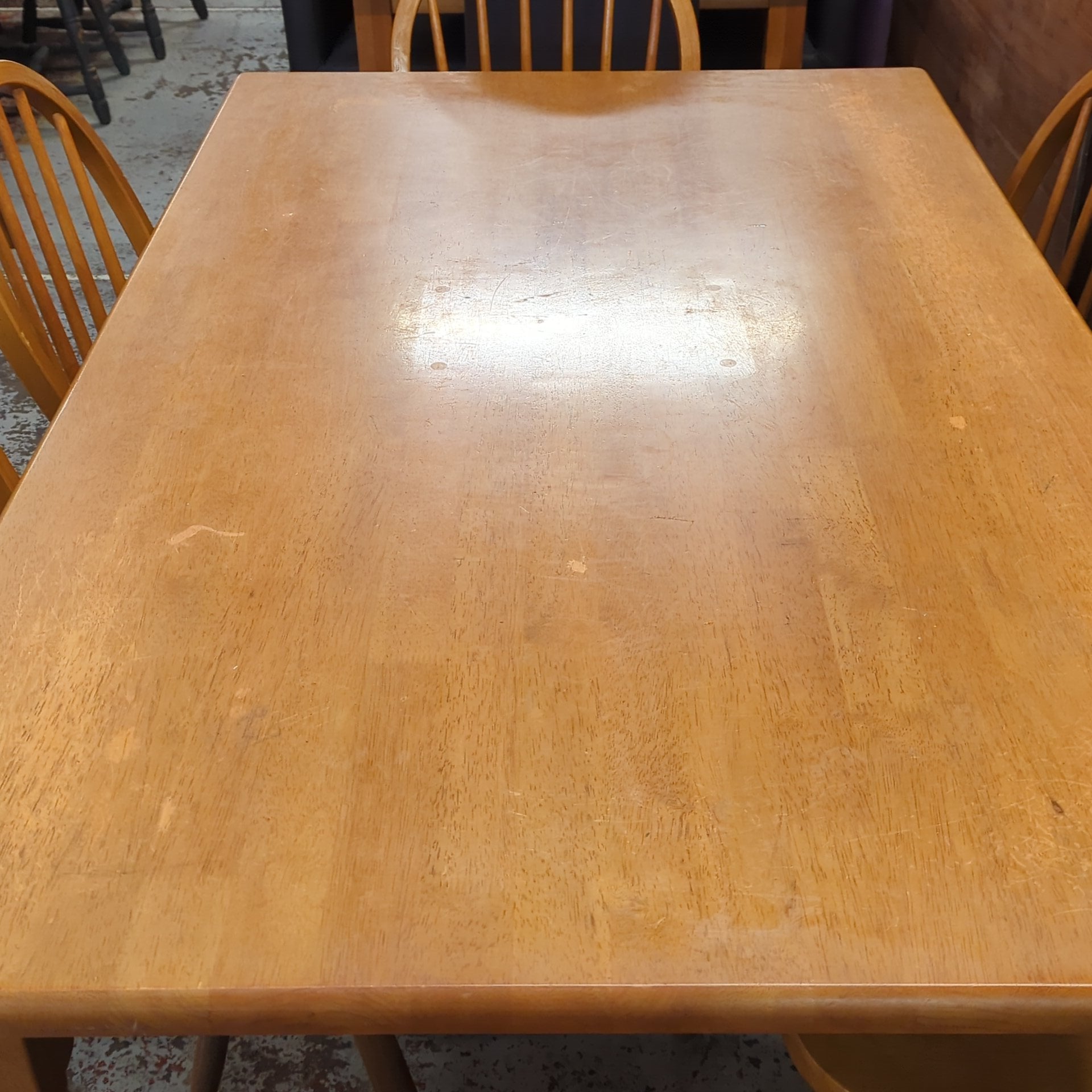 This Table and Six Chairs set combines durability and functionality. Constructed with substantial materials, the table and chairs provide stability and long-term use. While minor scuffs on the table surface may be present, they do not compromise the overall integrity, making it a suitable choice for both casual and formal environments.