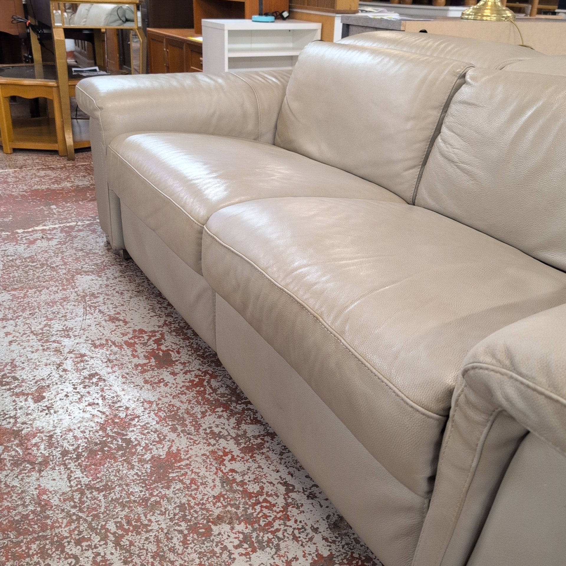 Discover sophisticated comfort with this Italian leather electric reclining three-seater sofa by Nicoletti. Crafted from 100% genuine leather in an elegant dark cream finish, it features motorised headrests and full reclining functionality for customisable relaxation. Each seat operates independently, allowing you and your guest to find your perfect position. The sofa has been PAT tested for safety and is fully operational. Minor surface marks are present and can be easily addressed with appropriate leather care products. A statement piece that combines Italian craftsmanship with modern convenience.