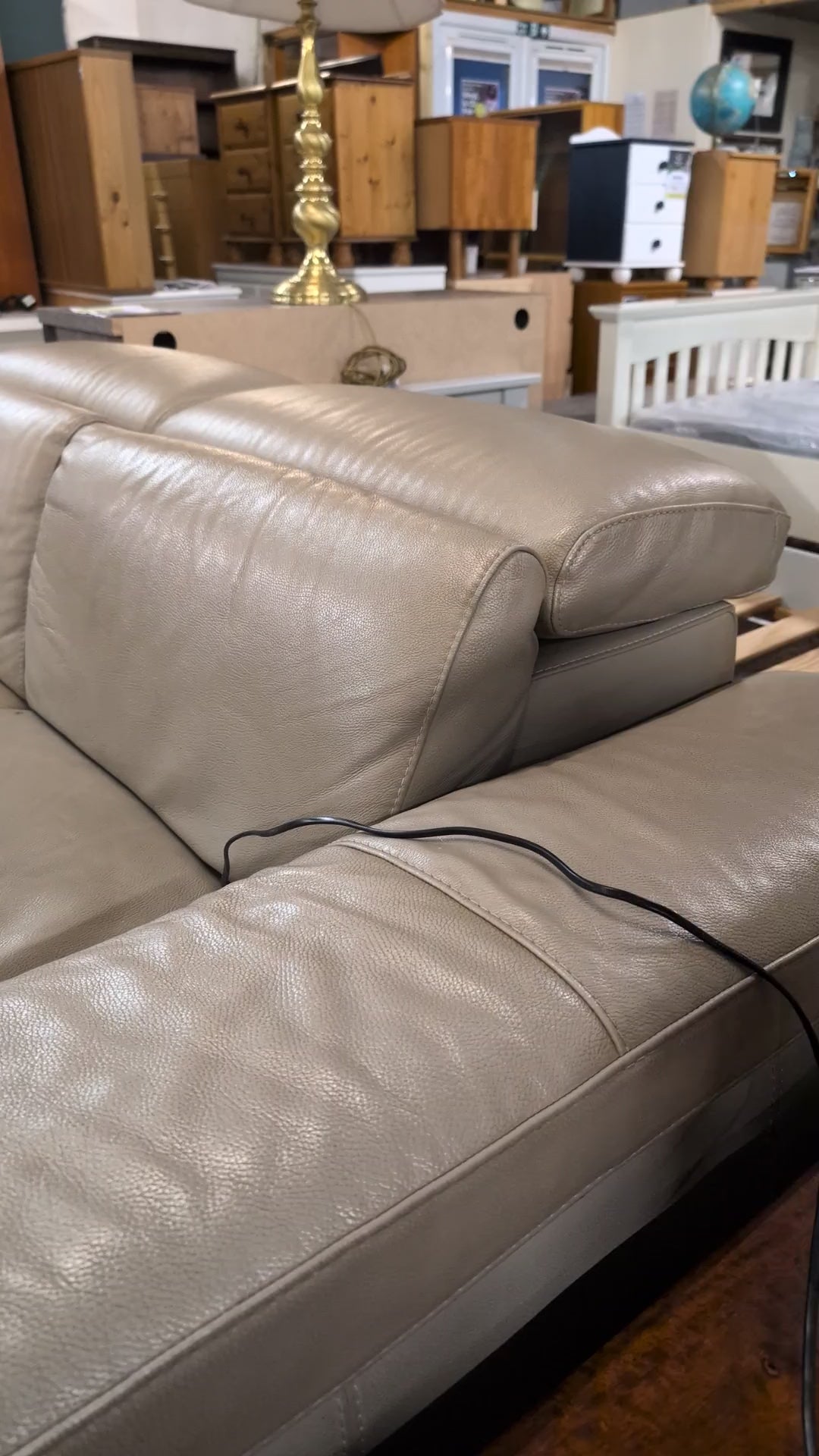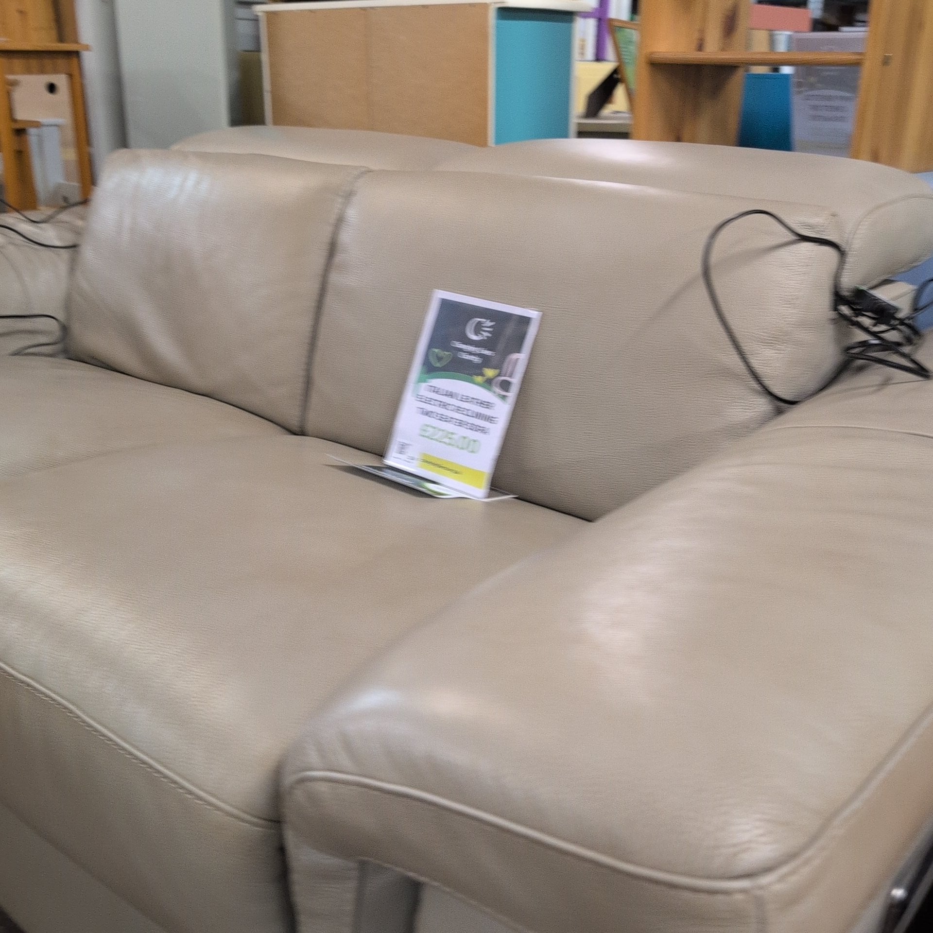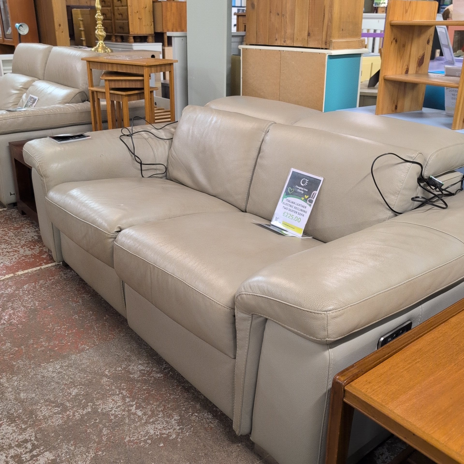 Discover sophisticated comfort with this Italian leather electric reclining two-seater sofa by Nicoletti. Crafted from 100% genuine leather in an elegant dark cream finish, it features motorised headrests and full reclining functionality for customisable relaxation. Each seat operates independently, allowing you and your guest to find your perfect position. The sofa has been PAT tested for safety and is fully operational. Minor surface marks are present and can be easily addressed with appropriate leather care products. A statement piece that combines Italian craftsmanship with modern convenience.