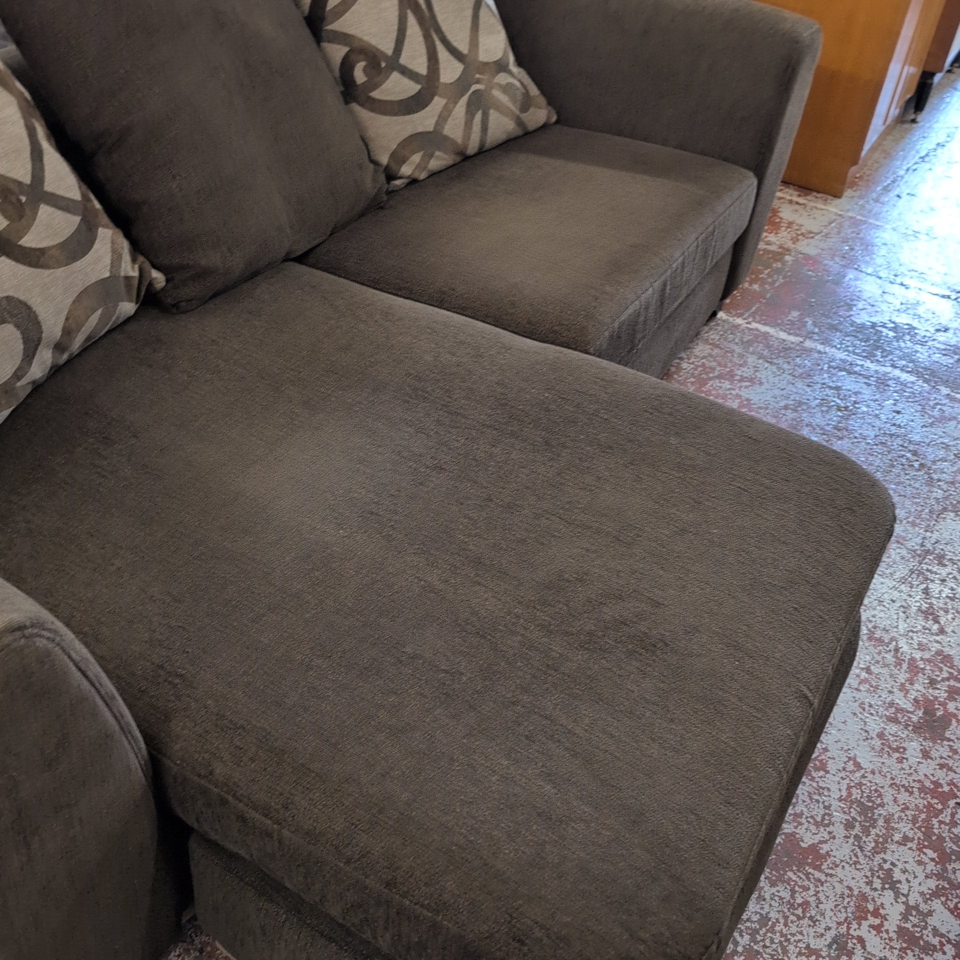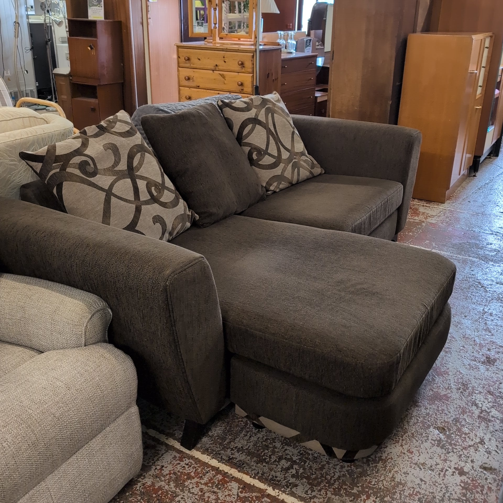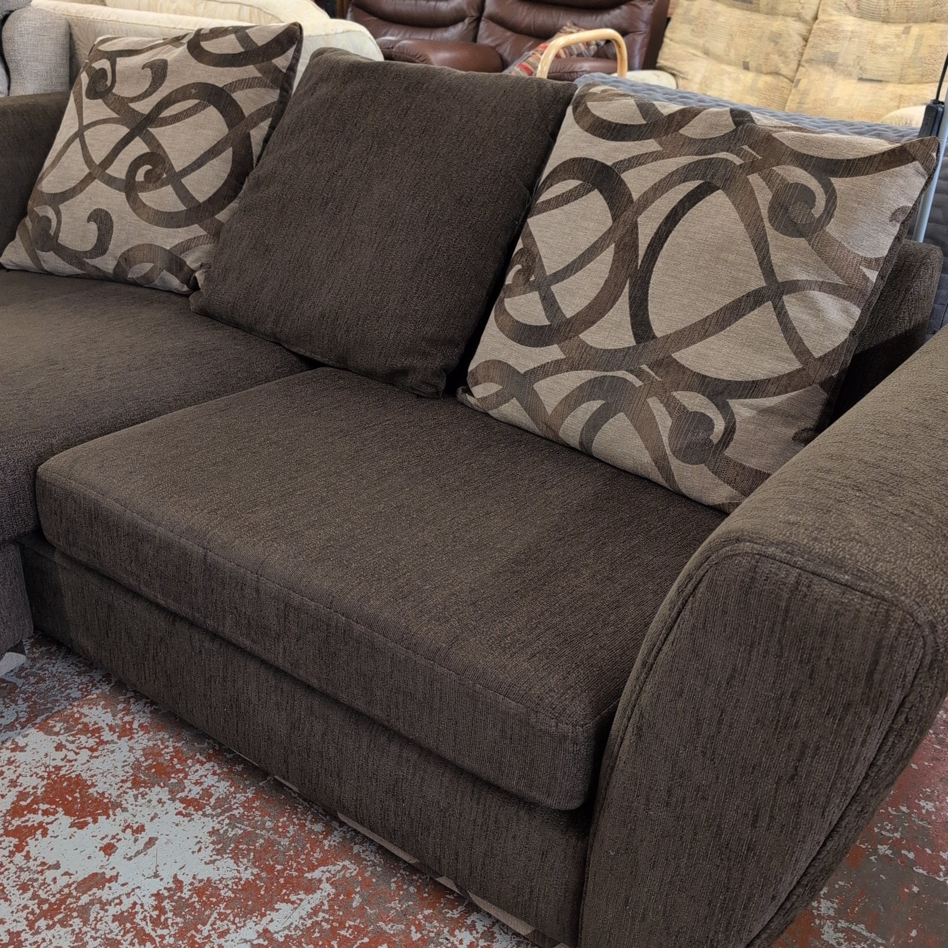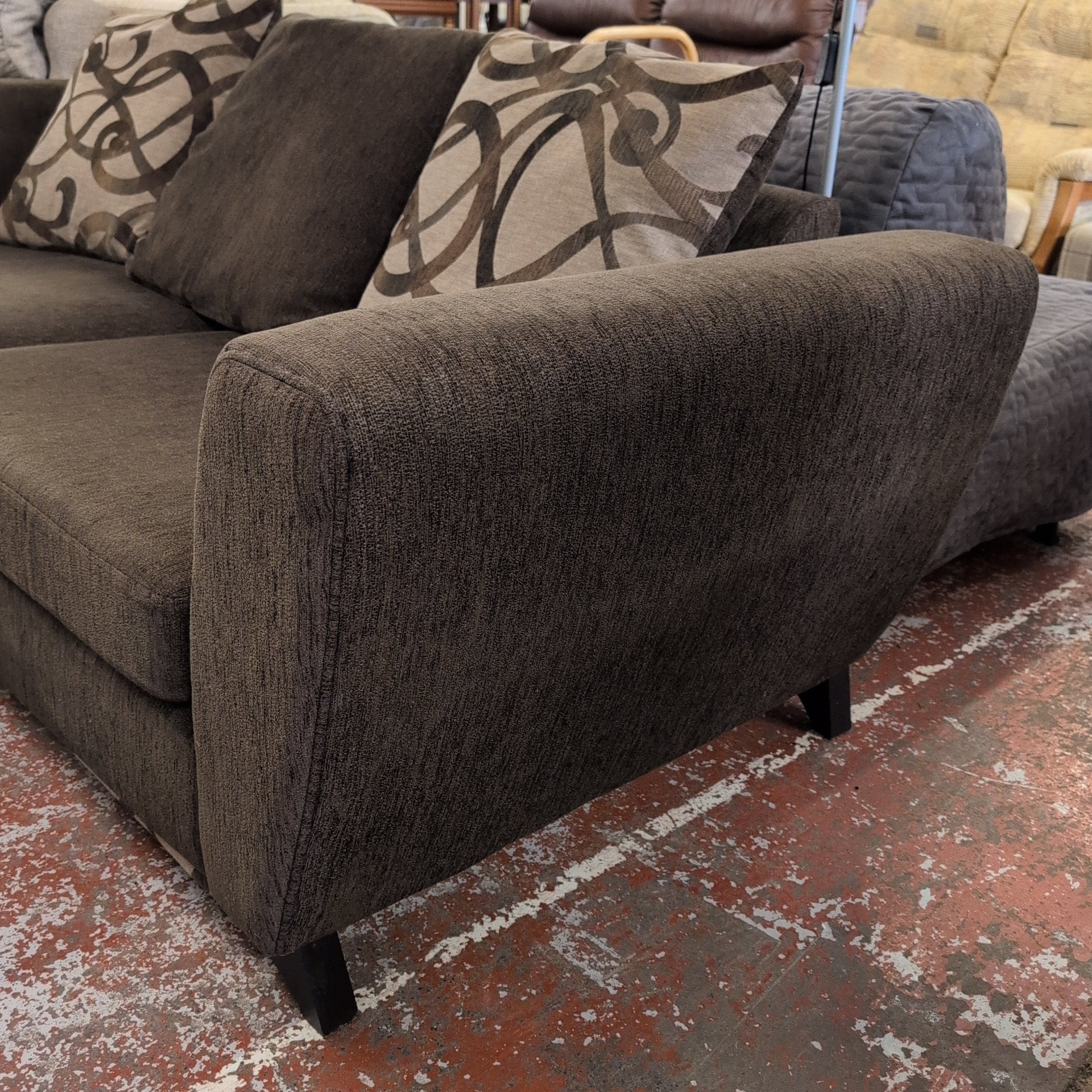 Handcrafted brown upholstered sofa featuring a distinctive asymmetrical design with an extended chaise-style end. The scatter cushion back provides flexible comfort and visual interest, while the generously proportioned seating accommodates multiple users with ease. Light surface marks on the arms add authentic character, reflecting the piece's artisanal heritage and lived-in appeal. An excellent choice for those seeking substantial, statement-making furniture with genuine craft quality.