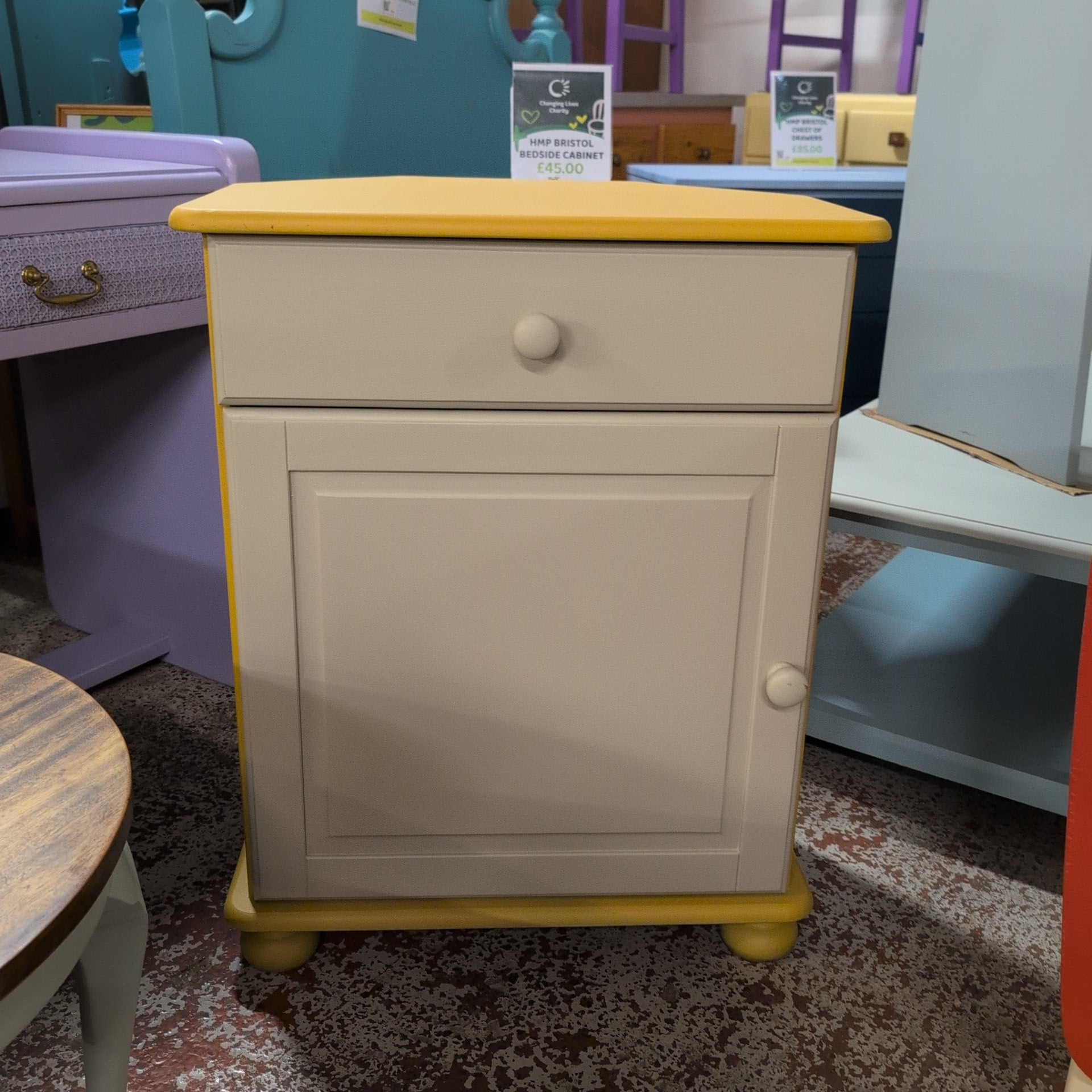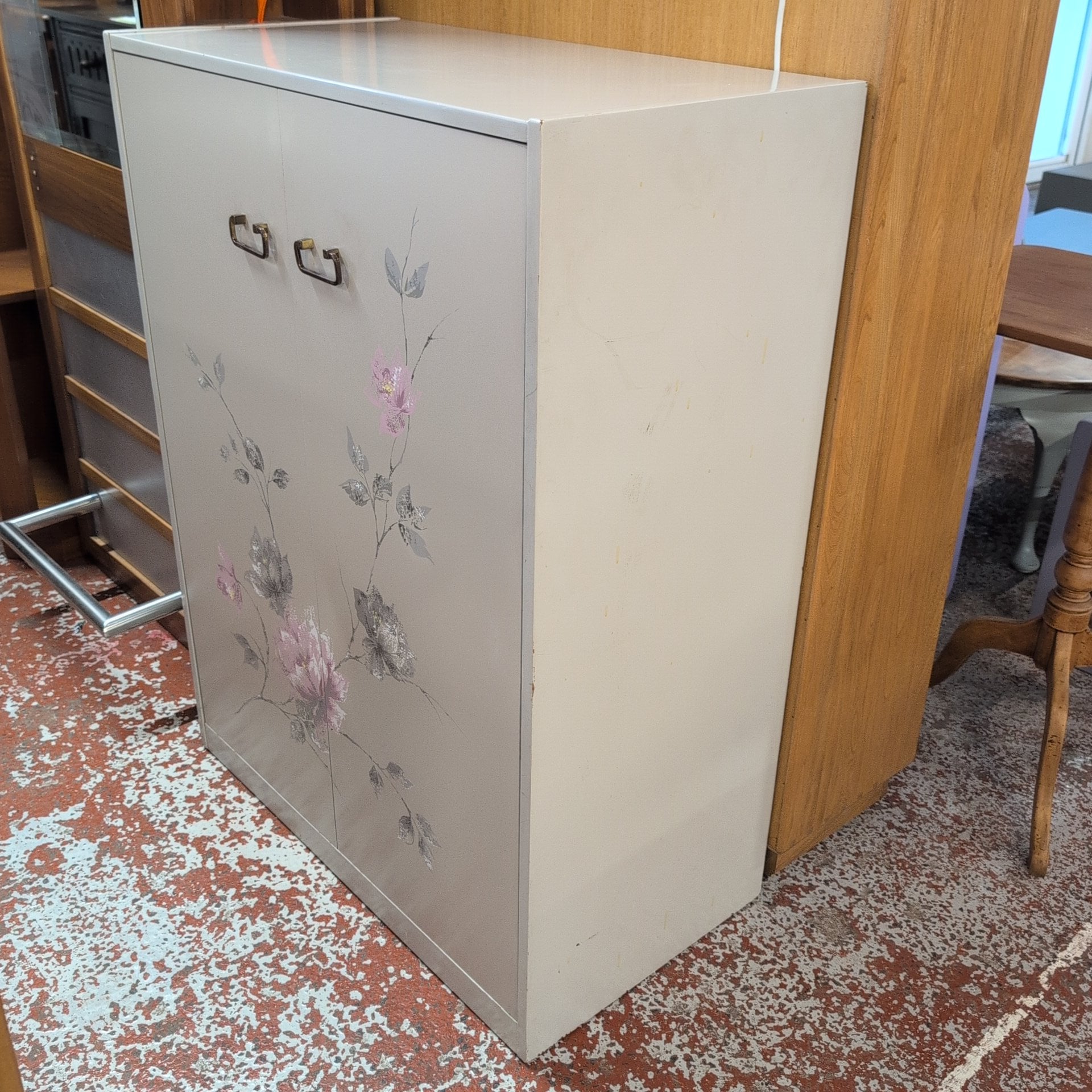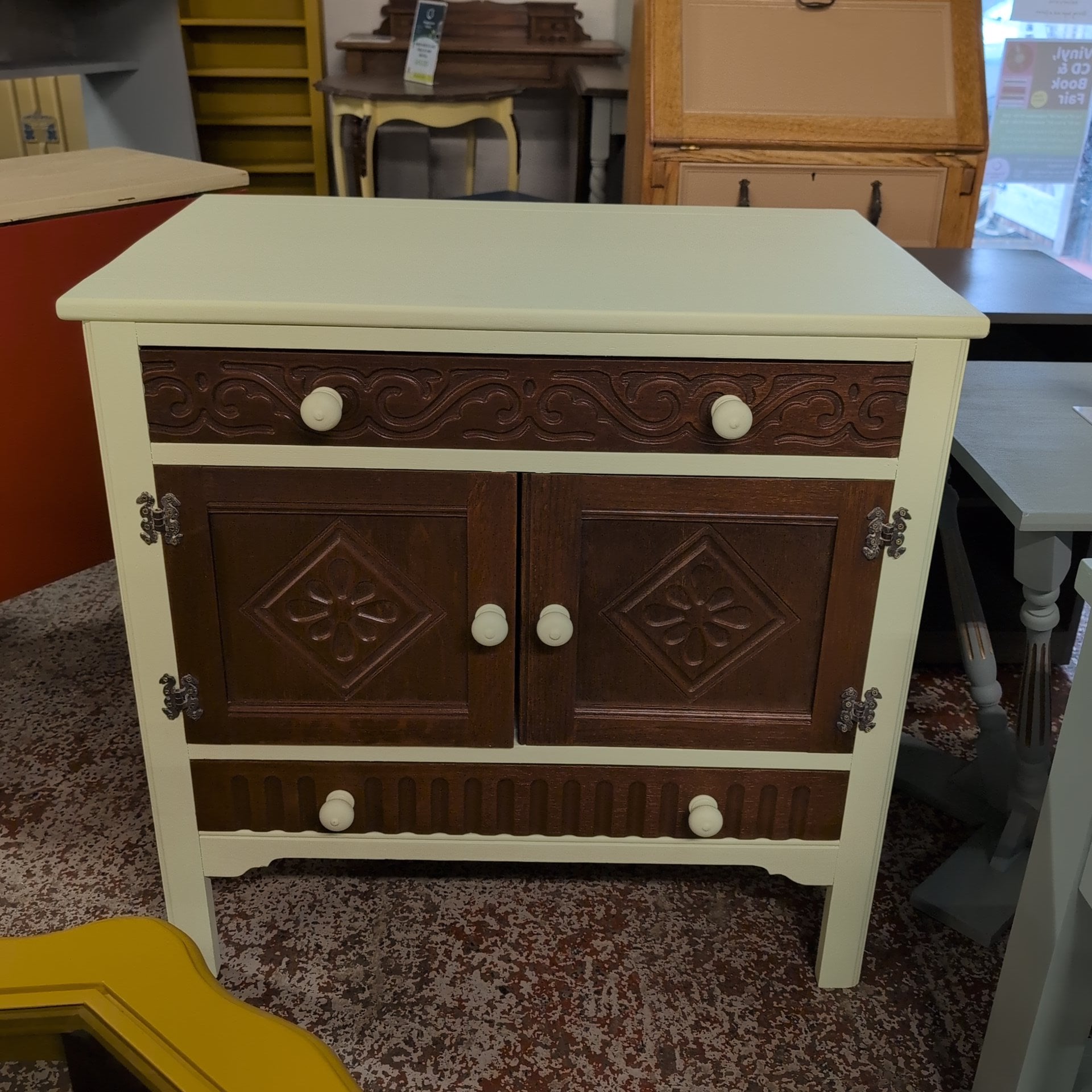 Liam, our pioneering volunteer in upcycling, has crafted this elegant drop-down cabinet showcasing his five years of growing expertise. Featuring a sophisticated blend of two grey tones from the Autentico paint range, the cabinet is beautifully complemented by a polished wooden top. This piece combines skilled craftsmanship with timeless design, making it a standout addition to any space.