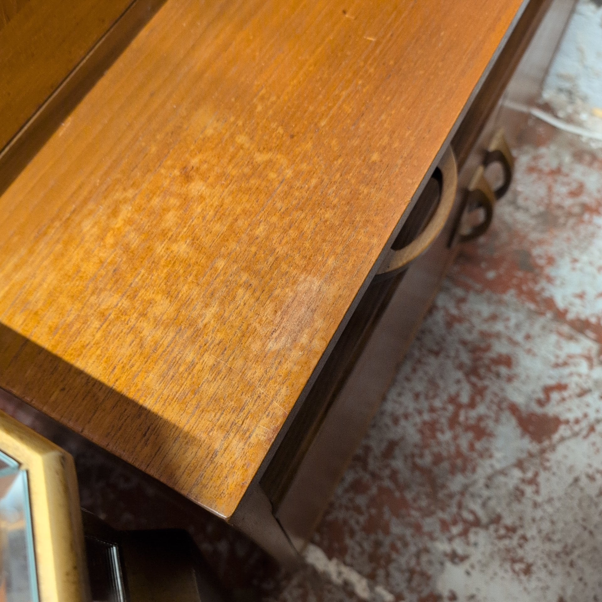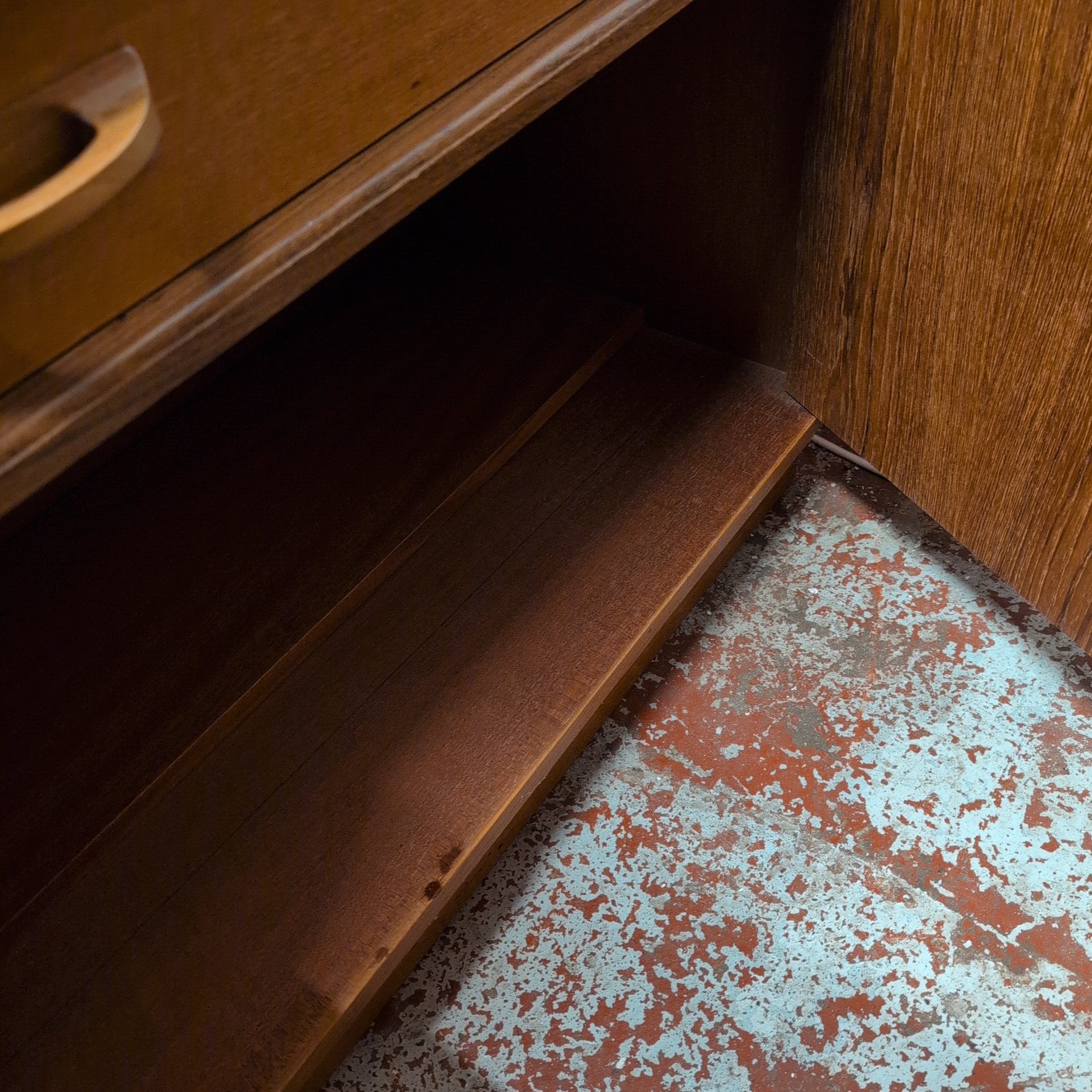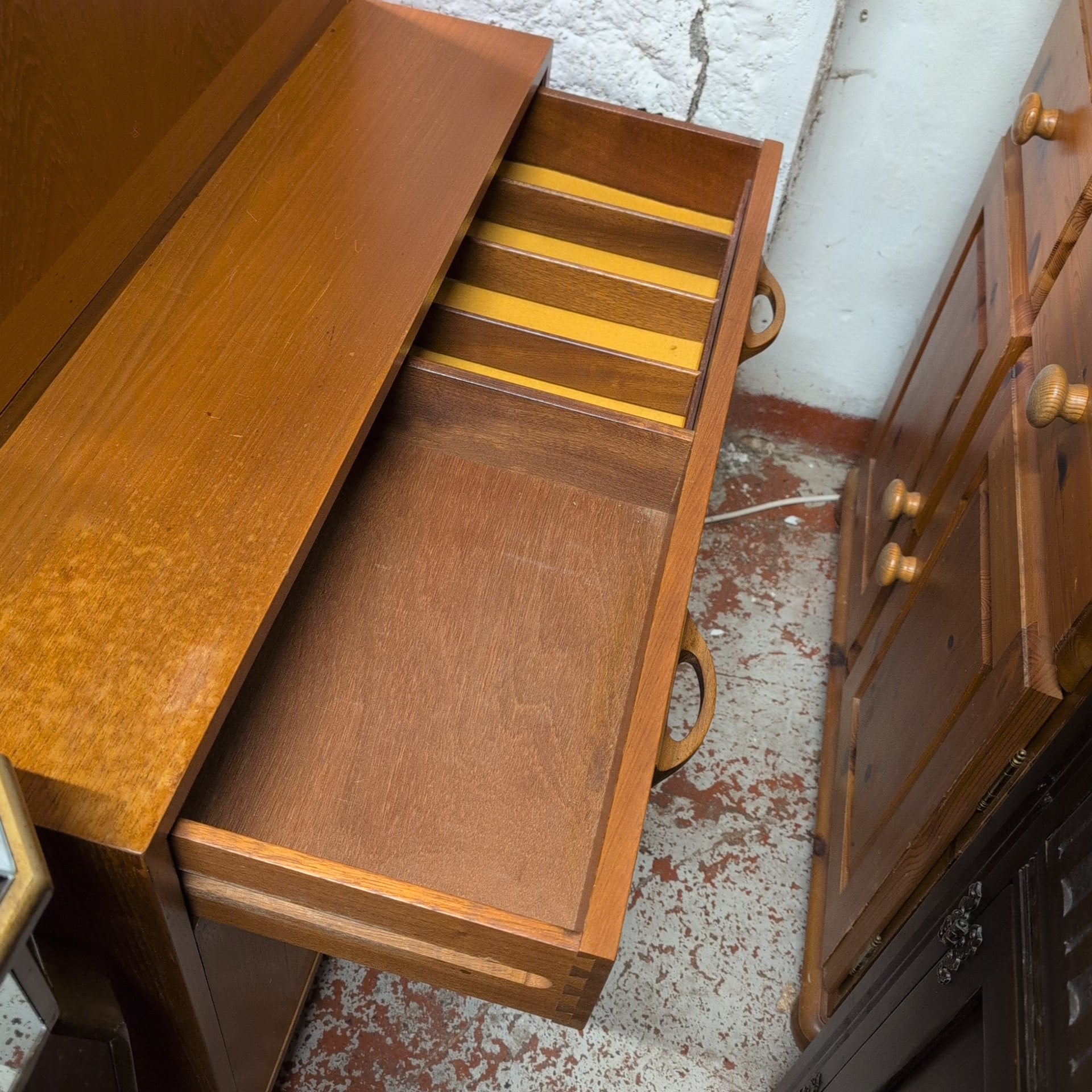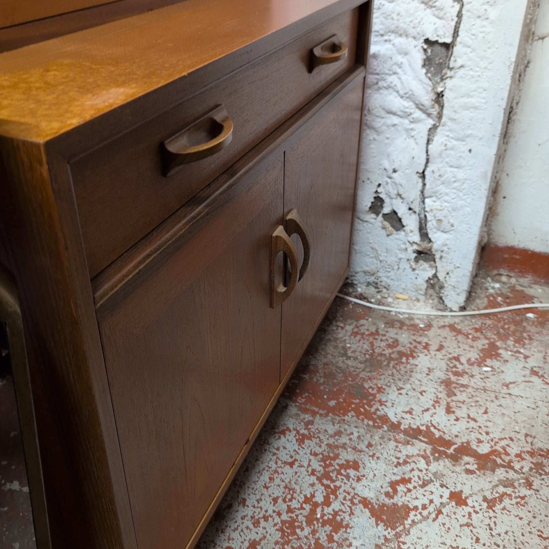 This striking mid-century teak wall unit combines form and function with timeless appeal. The piece features three generous shelves perfect for displaying treasured items, a pull-down door revealing a dedicated drinks cabinet, plus a practical drawer and double cupboard base for concealed storage. Crafted from warm teak, it brings authentic vintage character to any room. Please note: the back panel has a surface crack that hasn't penetrated through the structure, preserving the unit's integrity and adding to its authentic, lived-in charm.