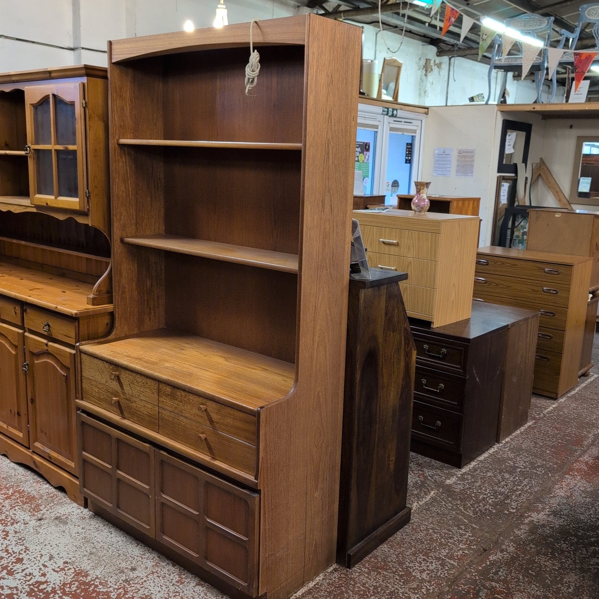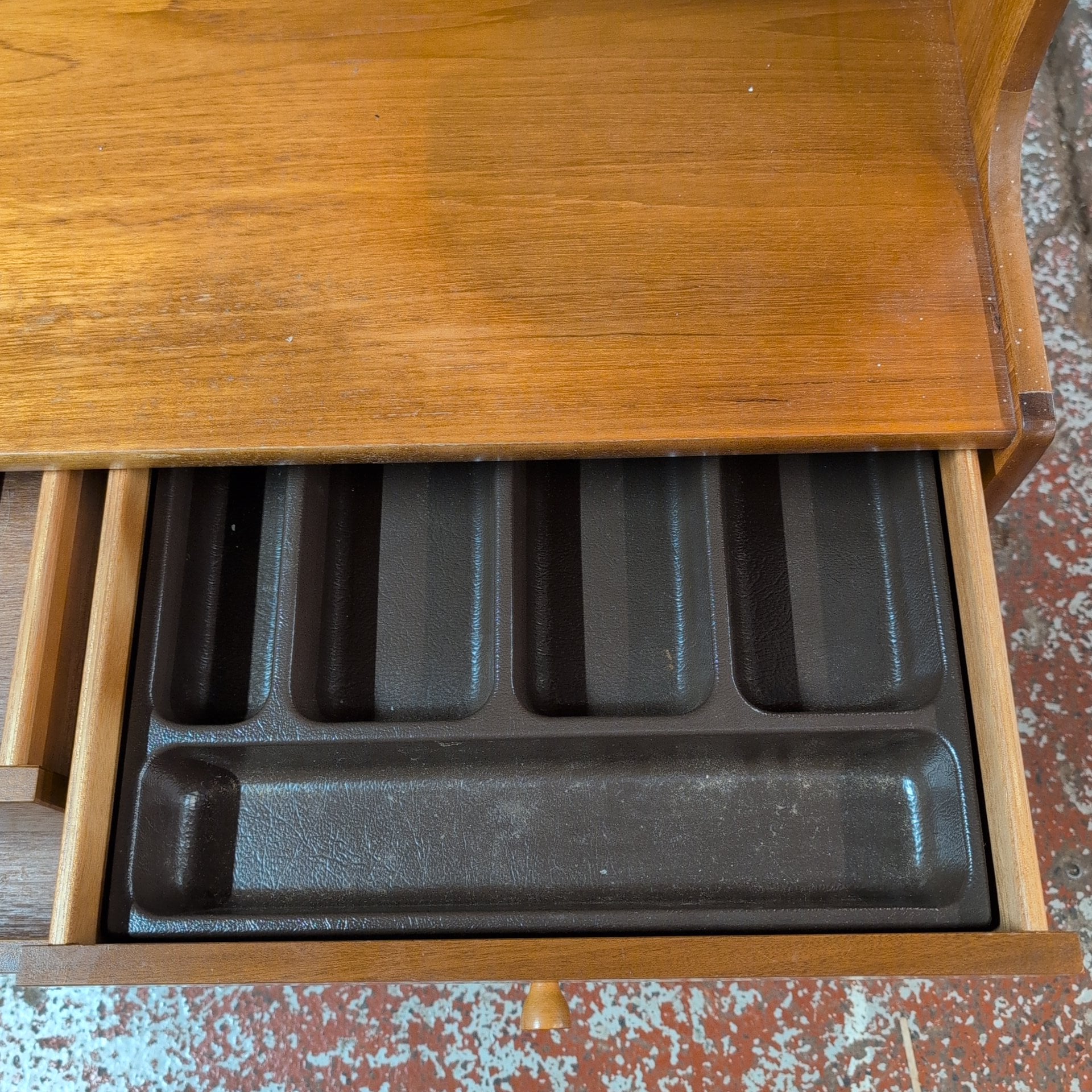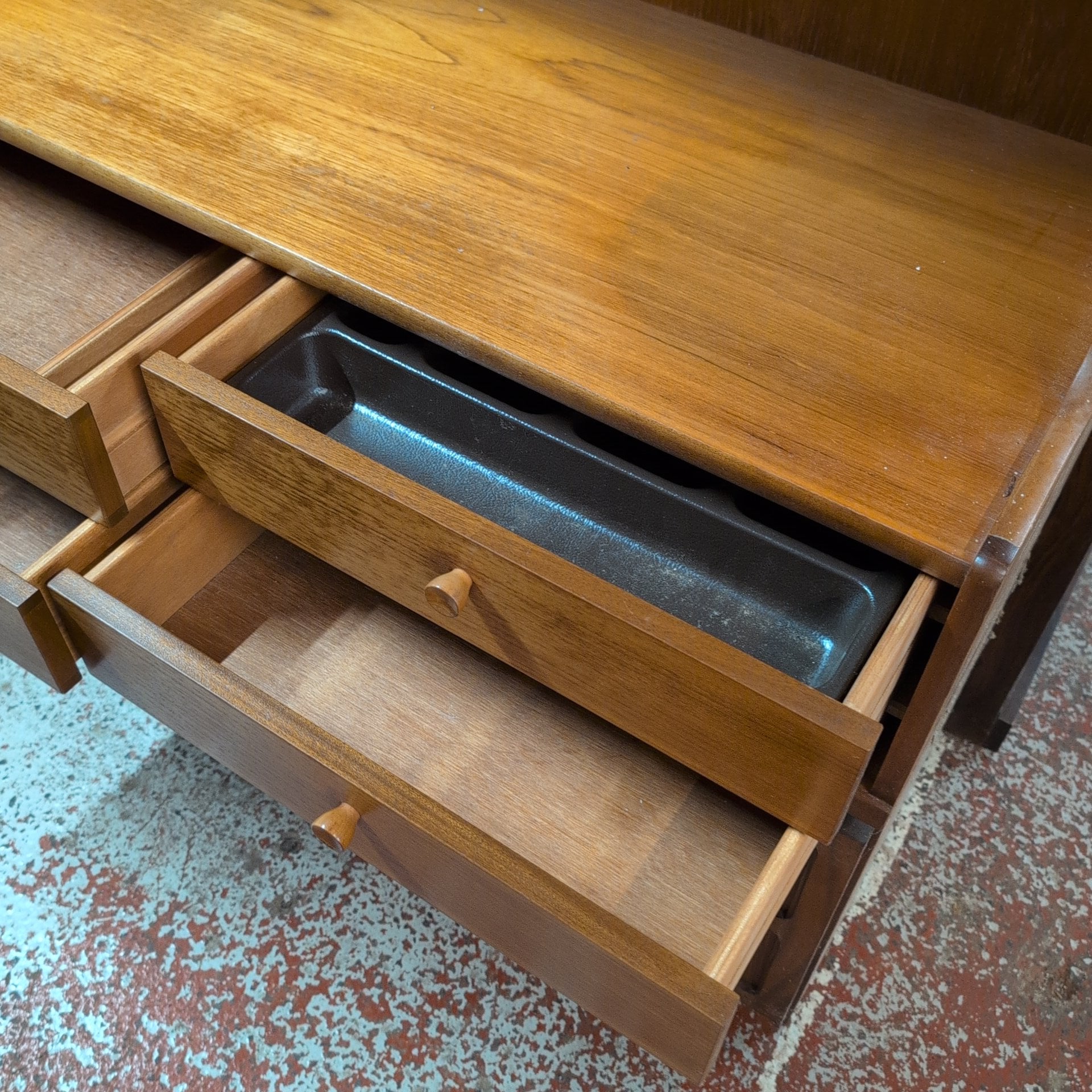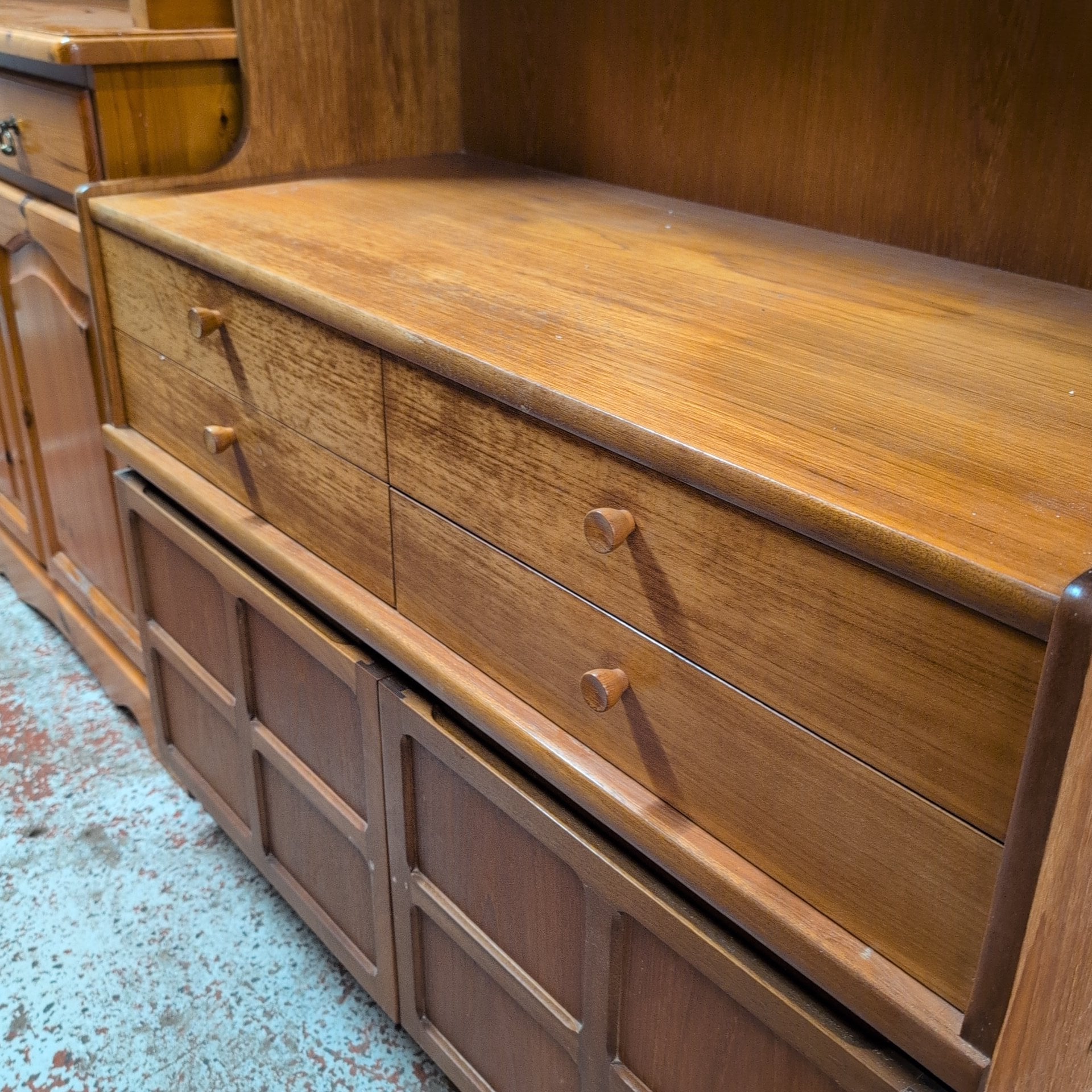 Nathan Teak Mid-Century Wall Unit. This striking teak wall unit exemplifies mid-century design with clean lines and functional elegance. Crafted from quality teak wood, it offers versatile storage with drawers and shelving to organise your living space. One drawer features a practical cutlery lining, ideal for dining room placement or kitchen storage. The piece displays authentic character, including subtle watermarks on the top surface that speak to its vintage heritage. A timeless investment for collectors and design enthusiasts seeking genuine mid-century furniture with provenance and charm.