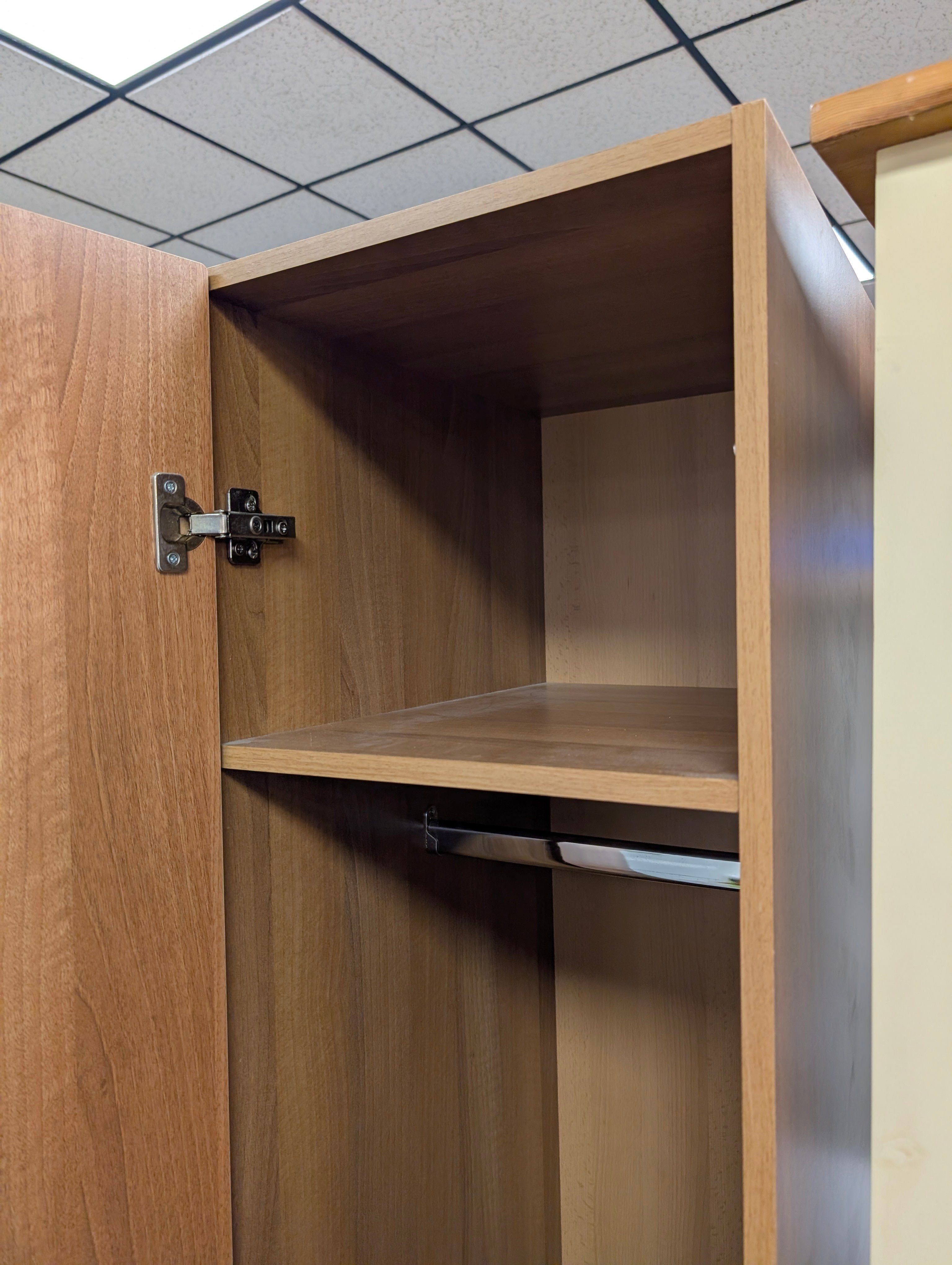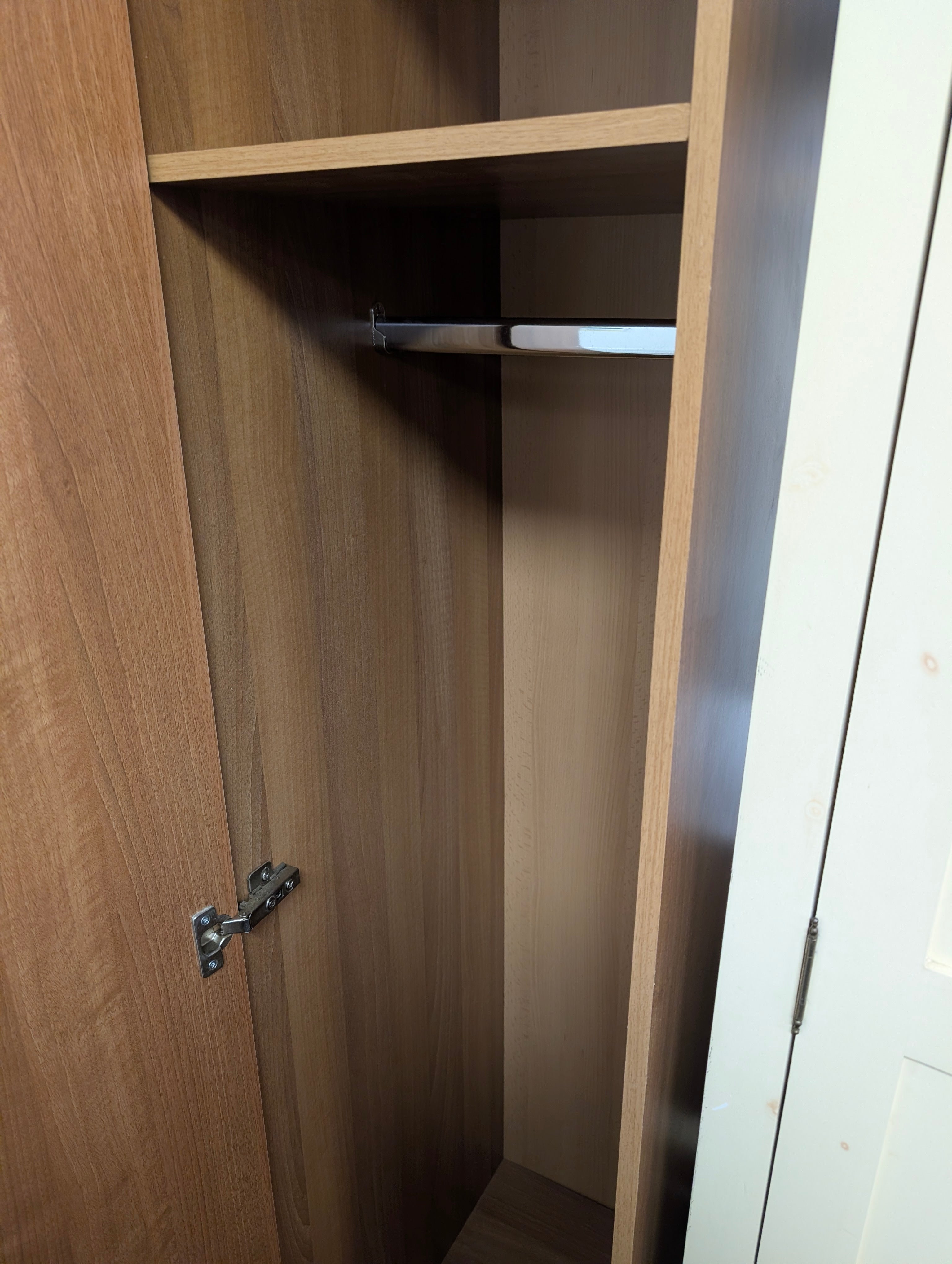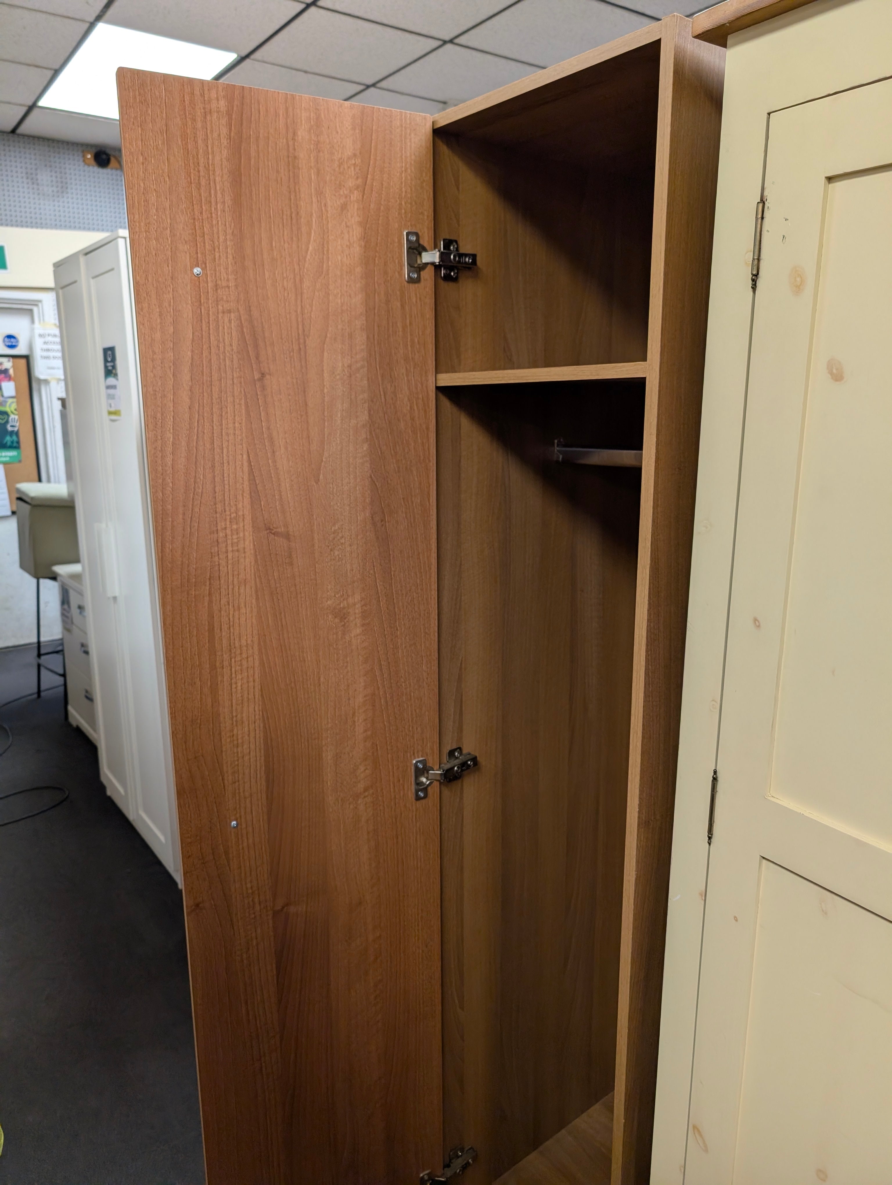 This contemporary wardrobe combines practical storage with understated elegance. Featuring a wood effect finish, it offers generous hanging space for your everyday wardrobe alongside a shelf at the top for additional storage or display. The streamlined design suits modern interiors whilst delivering the functionality you need for organised dressing. An ideal solution for bedrooms where style and storage capacity matter equally.