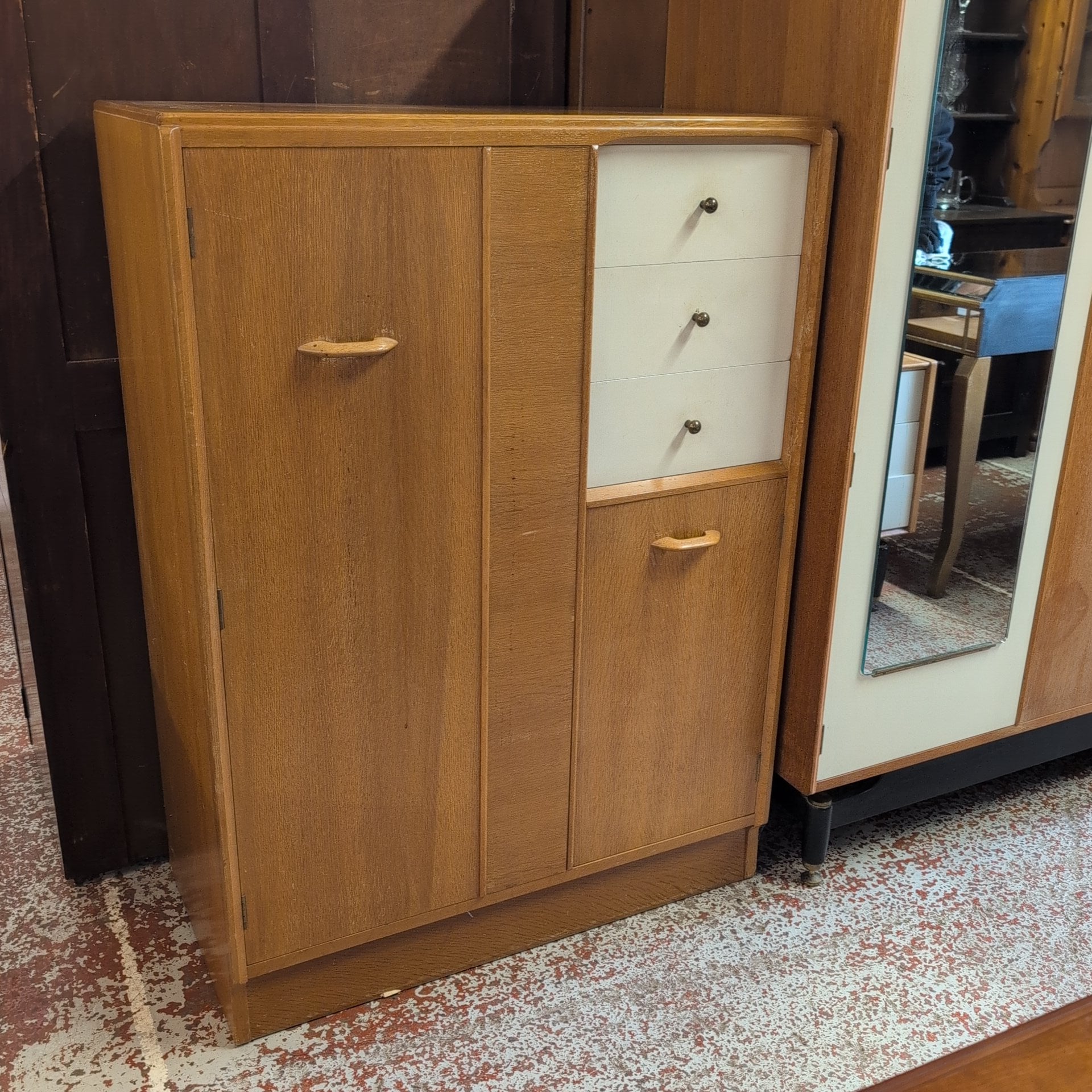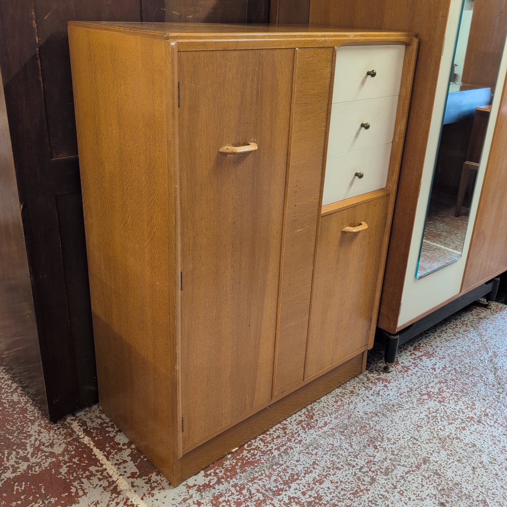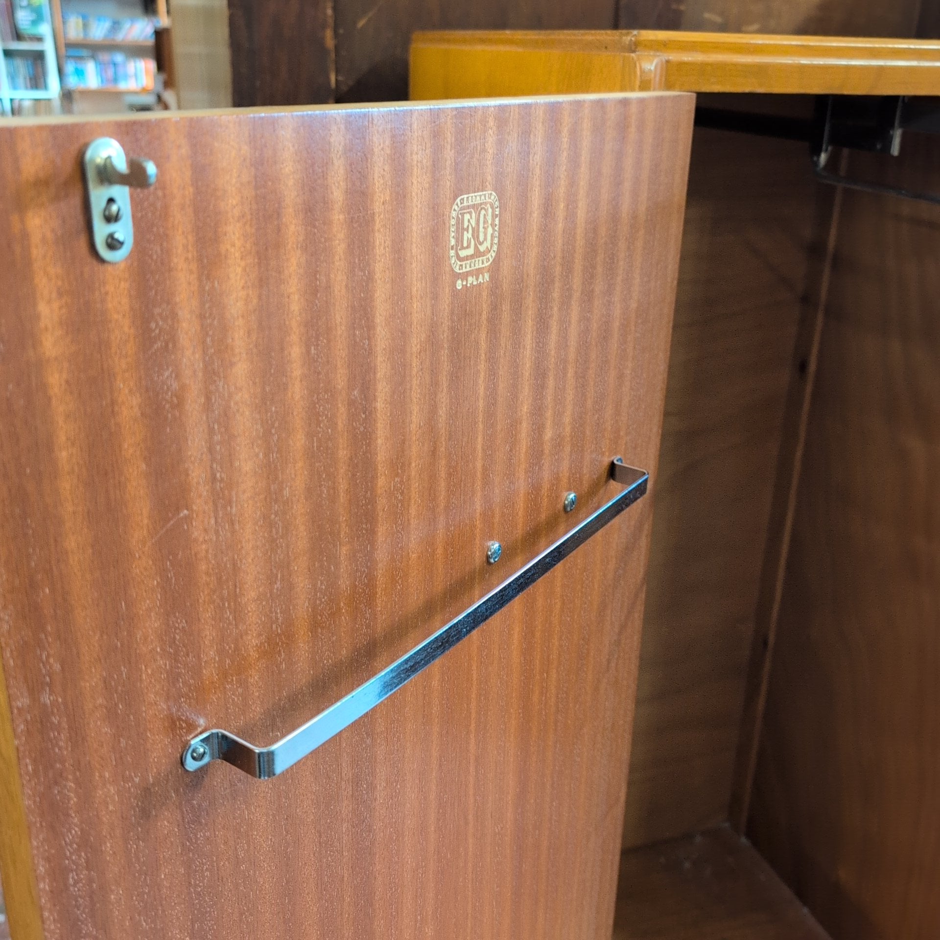 This authentic G-Plan Librenza gentleman's wardrobe exemplifies mid-century design excellence. Featuring the original maker's labels, this piece combines functionality with timeless style. The thoughtfully designed interior includes three spacious drawers for folded garments, a compact cabinet for accessories or delicate items, and a pull-out hanging rail system for suits and shirts. Built to G-Plan's exacting standards, this wardrobe remains a statement piece for discerning collectors and those seeking quality vintage furniture with proven durability and enduring appeal.